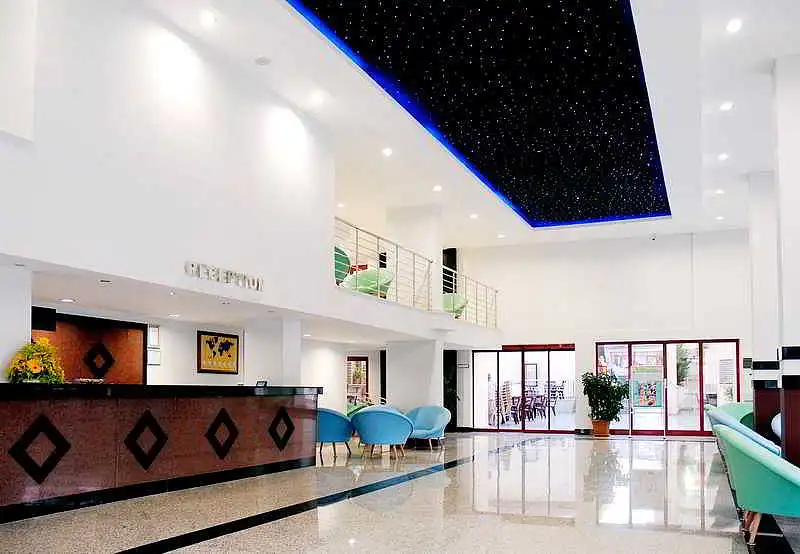 This air-conditioned beach hotel consists of 162 standard rooms, 4 suites and 18 family rooms. There is also a restaurant with a capacity of 300 people. Additionally, there are 4 bars, a pub, a café, a disco, a terrace and a snack bar which offers light snacks and cool drinks with a great atmosphere. Guests are welcomed into a lobby with a 24-hour reception and check-out service. Facilities at the hotel include a hotel safe, currency exchange facilities, cloakroom, lift access, newspaper stand, hairdressing salon and TV lounge. There is a childrens playground and kids club for the hotels younger guests. For an additional fee, guests may use the hotels Internet access and laundry service. Guests arriving by car may park in the hotels car park.