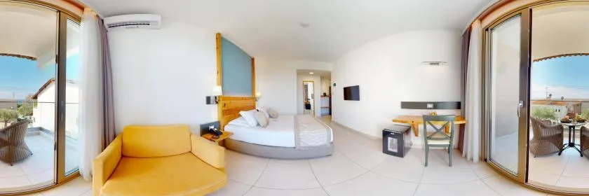 Camerele luminoase și confortabile sunt decorate in nuanțe mediteraneene și dispun de balcoane sau terase cu vedere spre mare sau grădină. Facilitățile principale includ piscină exterioară cu secțiune pentru copii, restaurant principal cu preparate grecești și internaționale, bar la piscină și lobby bar.