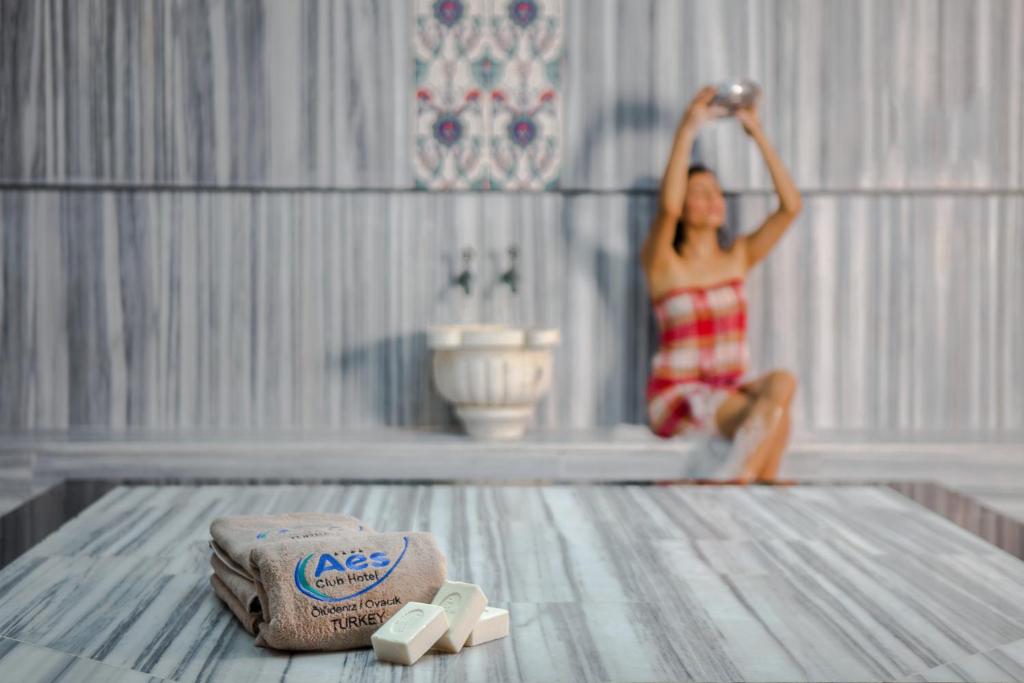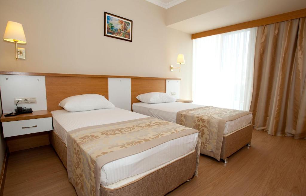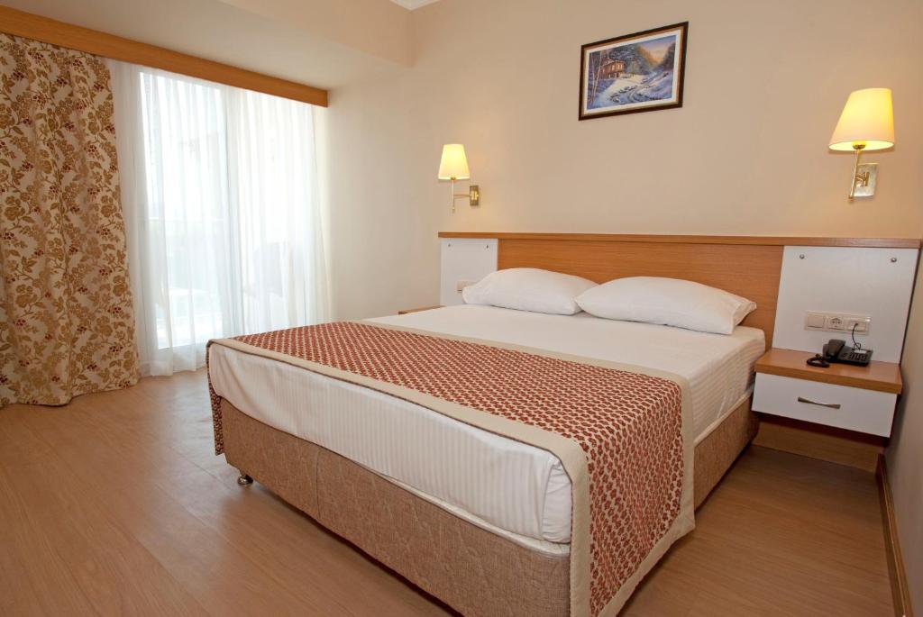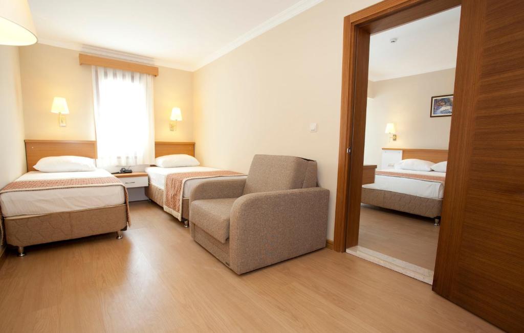 Cazare confortabilă: Hotelul Aes Club din Olüdeniz oferă camere de familie cu balcoane și băi private. Fiecare cameră include aer condiționat, WiFi gratuit și facilități moderne.