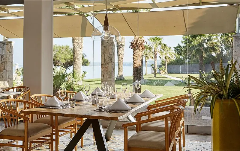 Hotelul ofera mic dejun si cina bufet in restaurantul principal. Mai exista un restaurant A la carte cu specific grecesc si pescaresc si un bar.