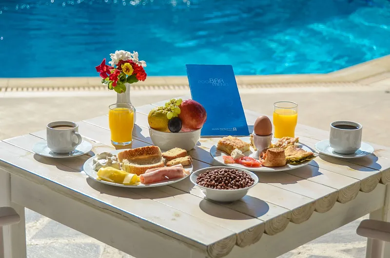 Guests can enjoy a rich Greek buffet breakfast until noon. Other hotel facilities include, a barbeque area, a snack bar and a pool bar.