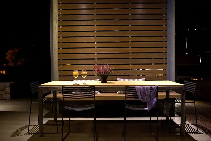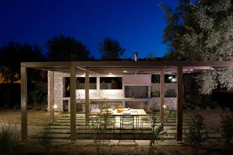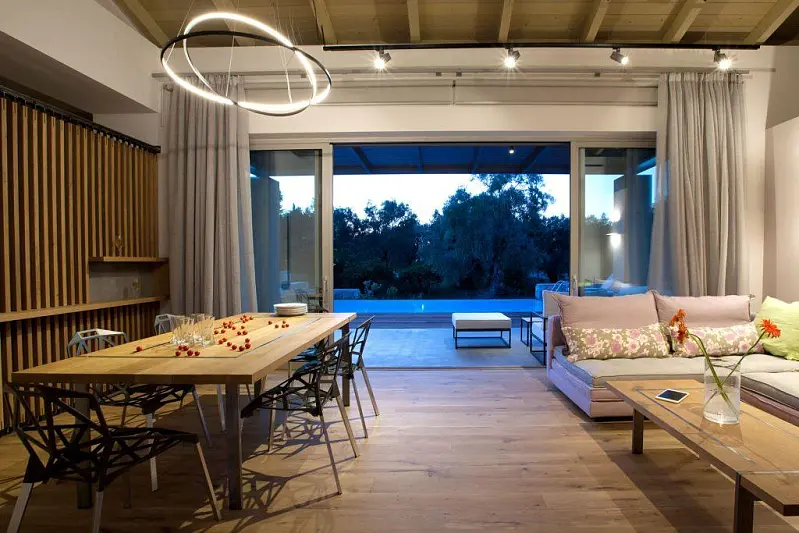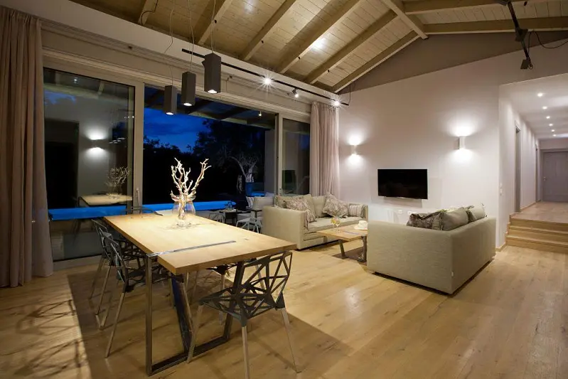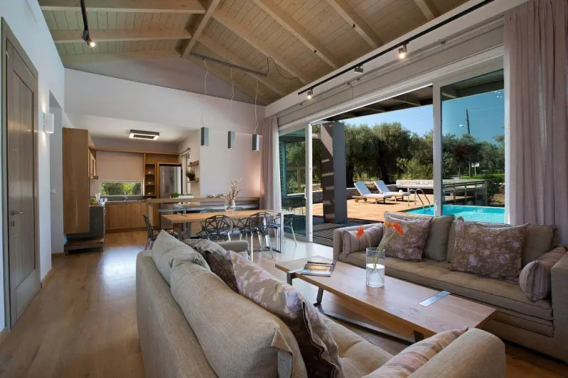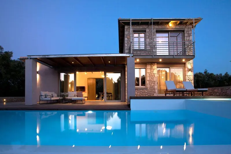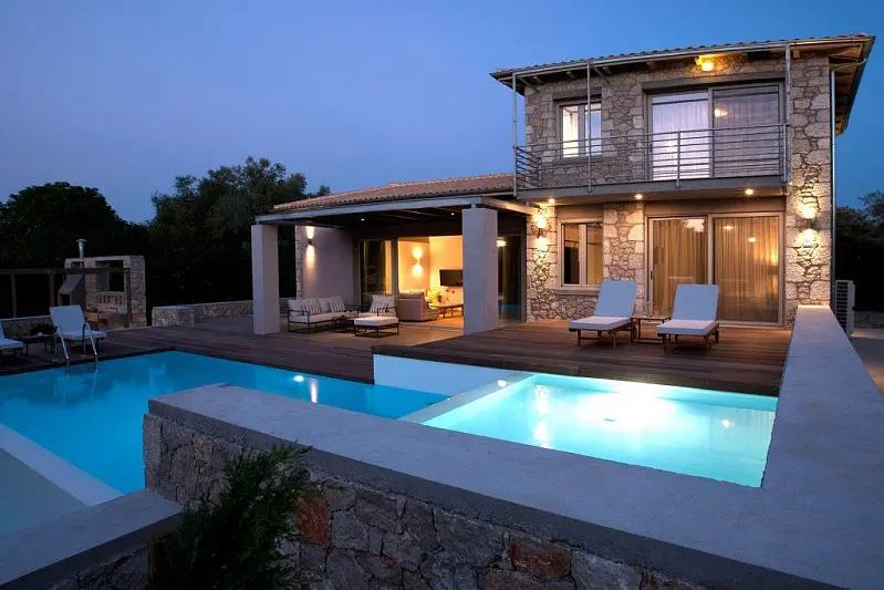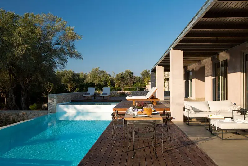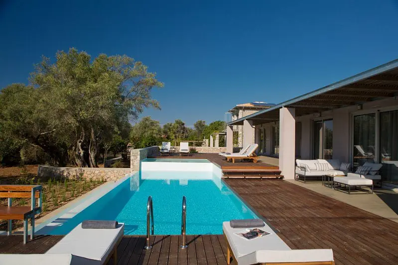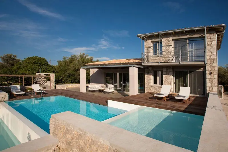 Close to Agios Ioannis sandy beach and surrounded by silvered olive groves ,these two contemporary villas seem to have it all.Luxurious character and contemporary comfort come in equal measure at these lovely stone built villas in the heart of Lefkas olive grove. The villas are encircled by olive trees and are built in a mature garden full of orange, lemon and apple trees. Inside the villas you can find a mix of modern and antique handmade furniture , high open beam wooden ceilings and oak floorings that give a touch of luxury. Outside among several spots to wine or dine there are loungers and a bistrot table beside the pool which is lit for a midnight dip. There is a big pergola with bench seating piled with cushions and all fresco dining next to a stone built-in barbeque. Each villa feature a spacious patio and a stylish private infinity pool set in hardwood sundeck.