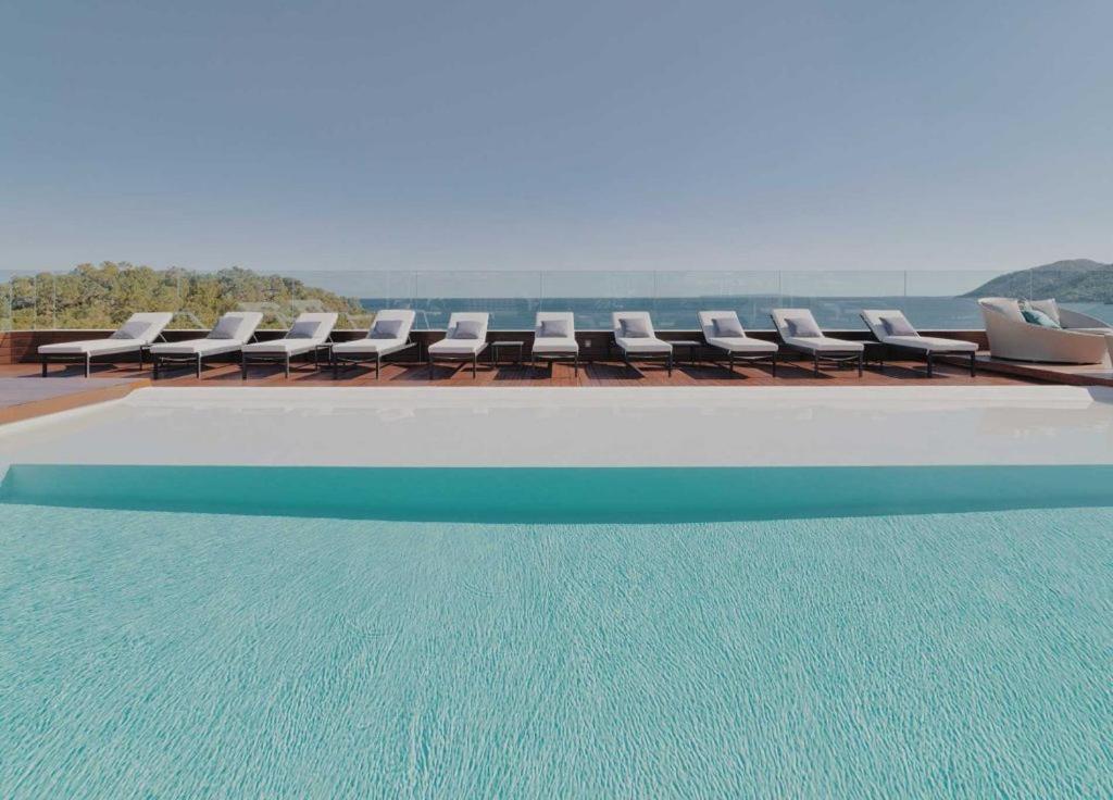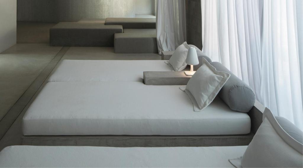 Aguas de Ibiza Grand Luxe Hotel - Small Luxury Hotel of the World este un hotel de design de lux, cu un centru spa gratuit și piscină in aer liber. Hotelul are un bar cu terasă pe acoperiș, destinat exclusiv adulților, cu vedere la portul de acord Santa Eulalia și la insula Formentera.