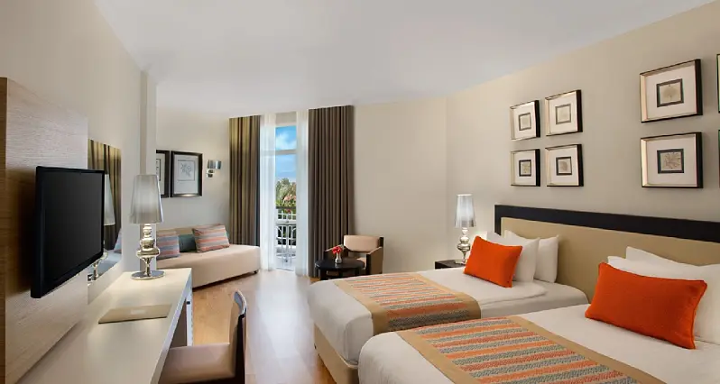 Camerele sunt dotate cu: baie, uscator de par, aer conditionat centralizat, TV, telefon, mini-bar, seif ( in camera, contra cost), balcon.