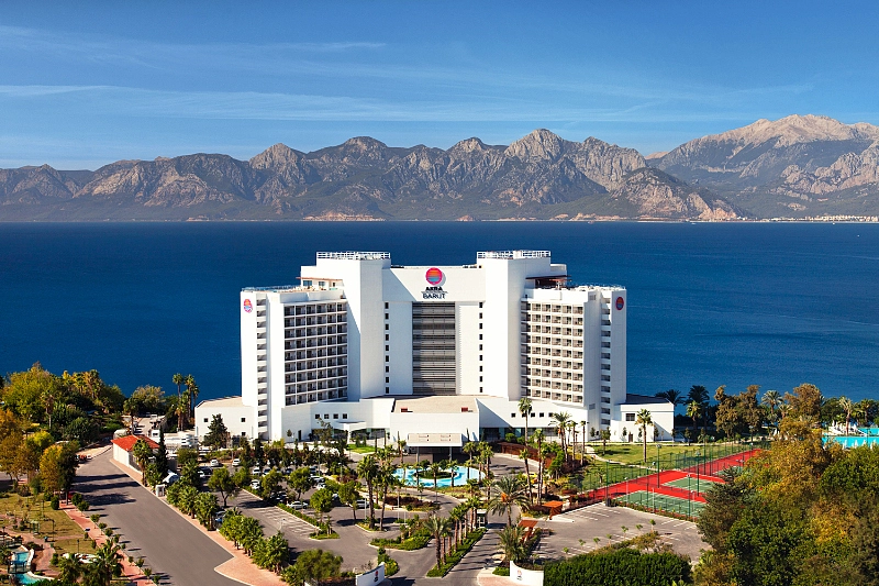 Designed as a multi-functional holiday resort and business hotel, it is ideal for holidaymakers and business travellers alike. Located 3 km from the city centre on the cliffs above the Mediterranean, there are beautiful views across the bay to the Taurus Mountains. Comprising of 482 rooms over 10 floors, the hotel features a private bathing platform at sea-level, outdoor and indoor facilities and the aqua park situated next door to the hotel. (Some facilities may not be operational year round due to weather/seasonal conditions).