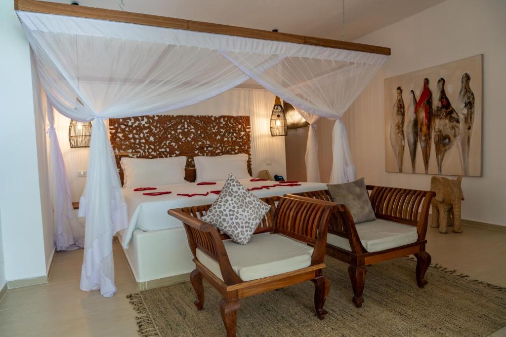 Alma Boutique Hotel se află in Jambiani, la cațiva pași de Plaja din Paje, și oferă un centru de fitness, o grădină, un lounge comun și parcare privată gratuită. Proprietatea oferă un restaurant, precum și un bar și facilități pentru sporturi acvatice. Proprietatea are o recepție deschisă non-stop, servicii de transport de la/la aeroport, room-service și WiFi gratuit in intreaga proprietate.