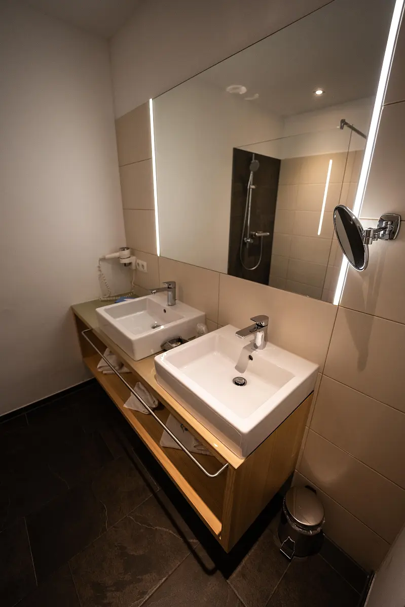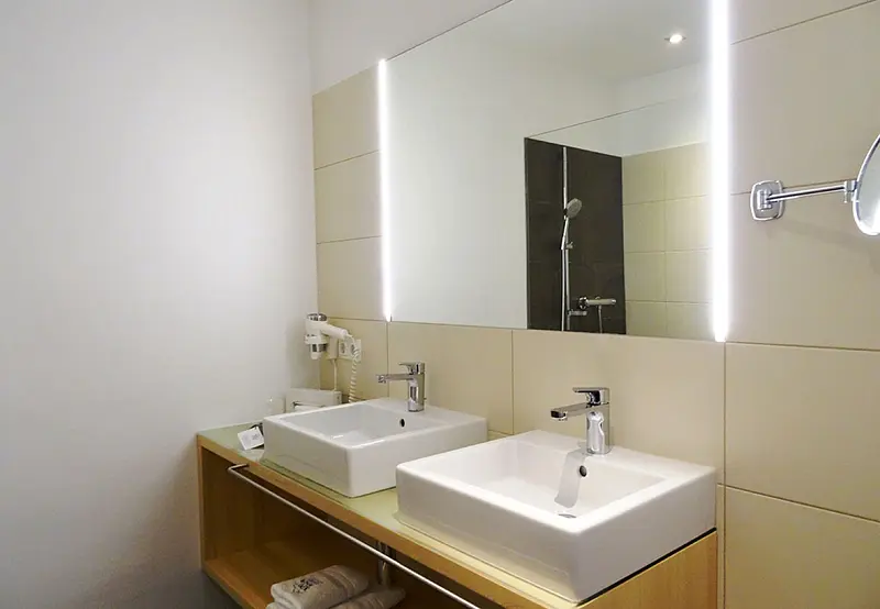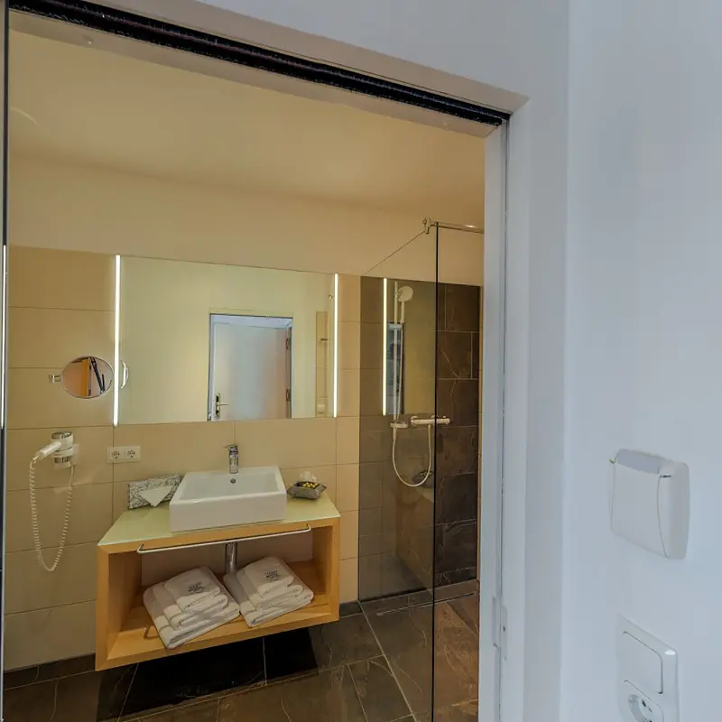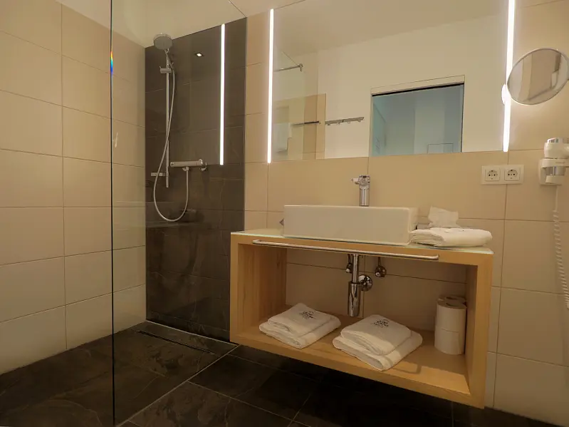 bath room: separat toilet, hair dryer, shower, bath robe - on request, optional payable in resort, EUR 10.00 per person and stay, bathing shoes - free of charge