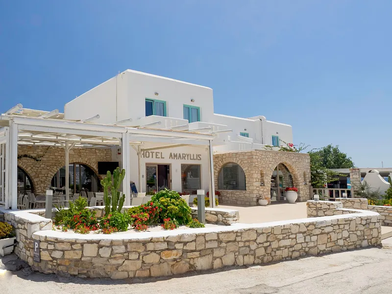 There, where the air freshens the atmosphere, the crystal clear waters reflect the majestic summer sun and the architecture in white and blue give away its Cycladic origins, you will find Amaryllis Beach Hotel, the ideal option for accommodation in Paros Island.