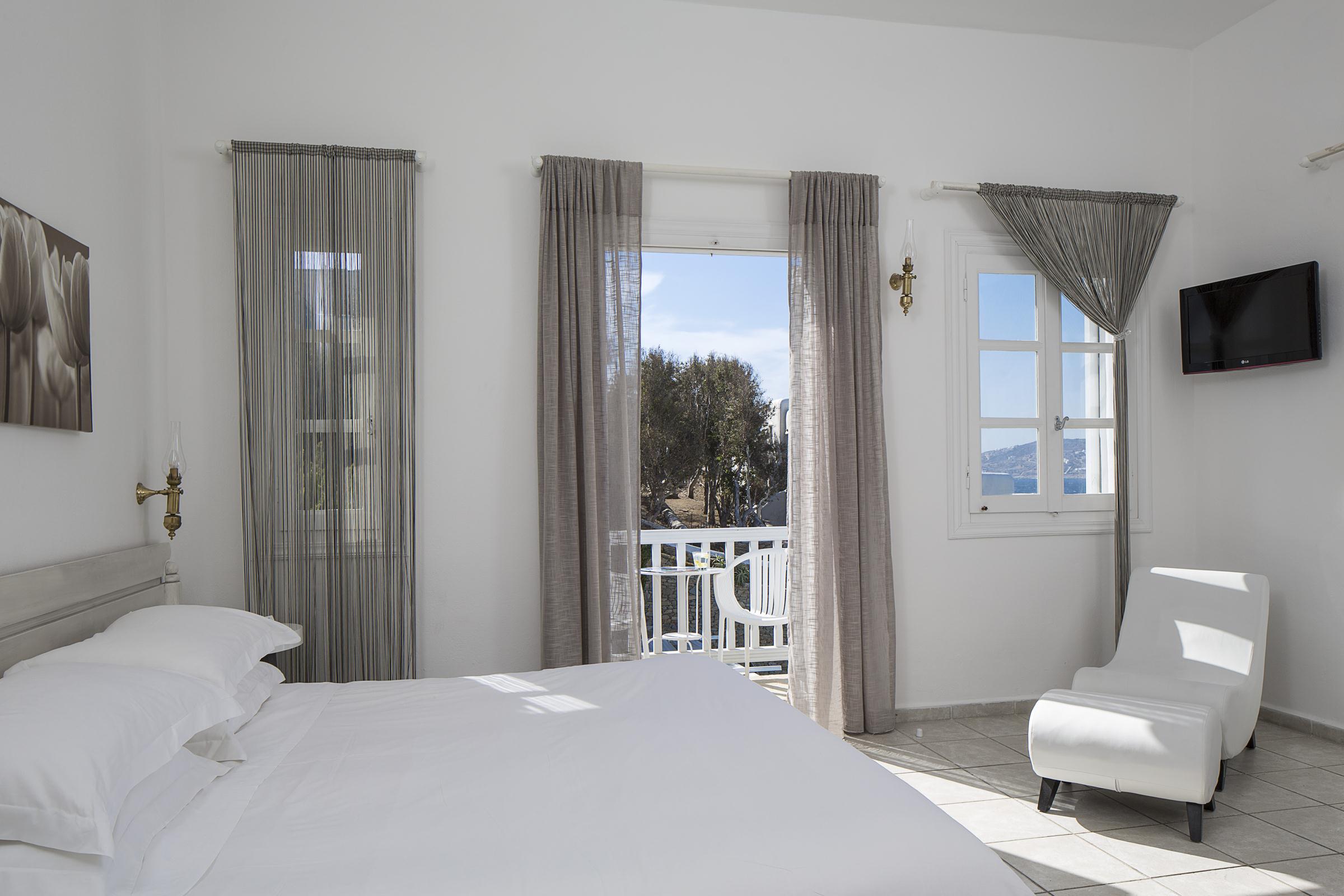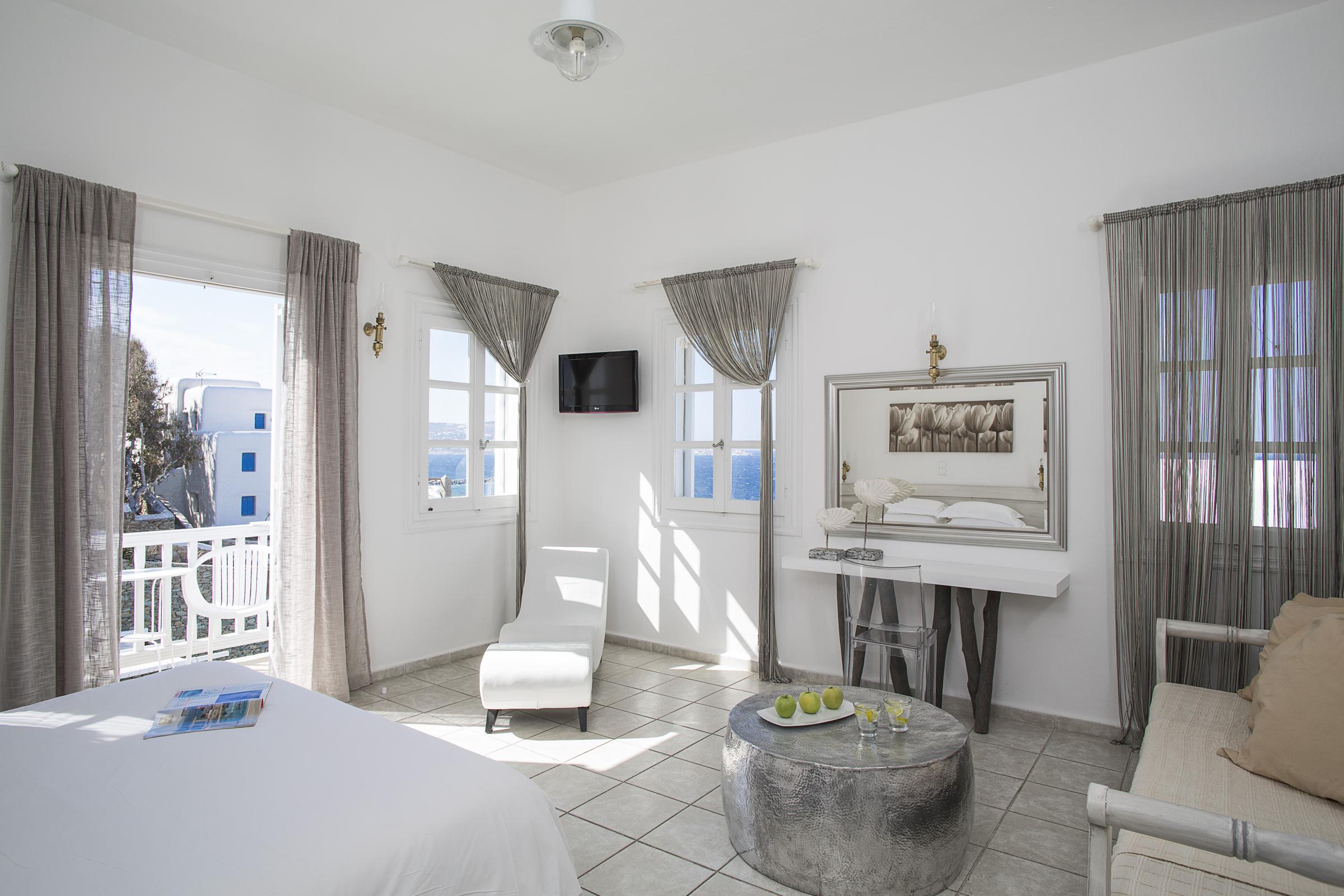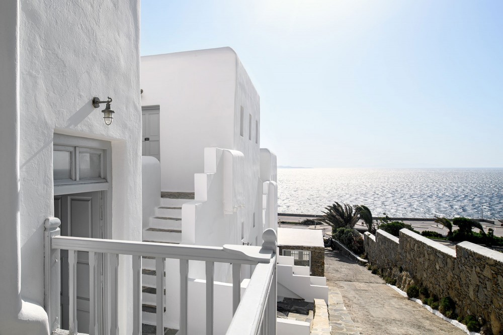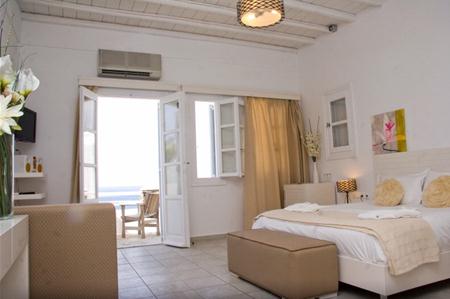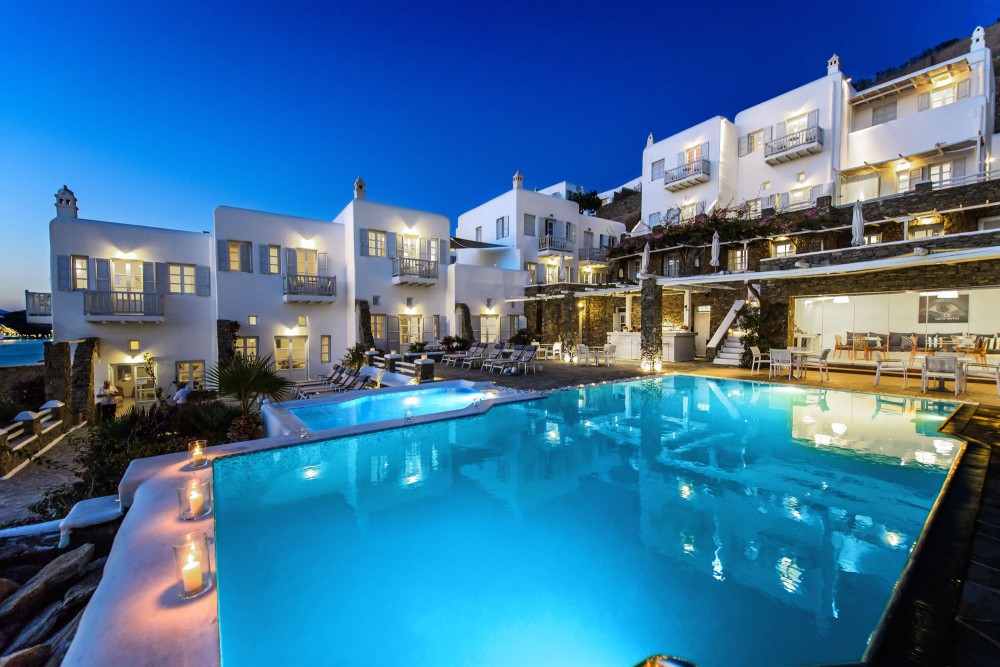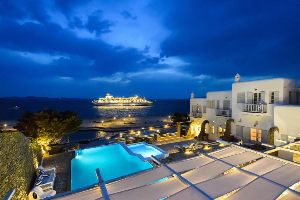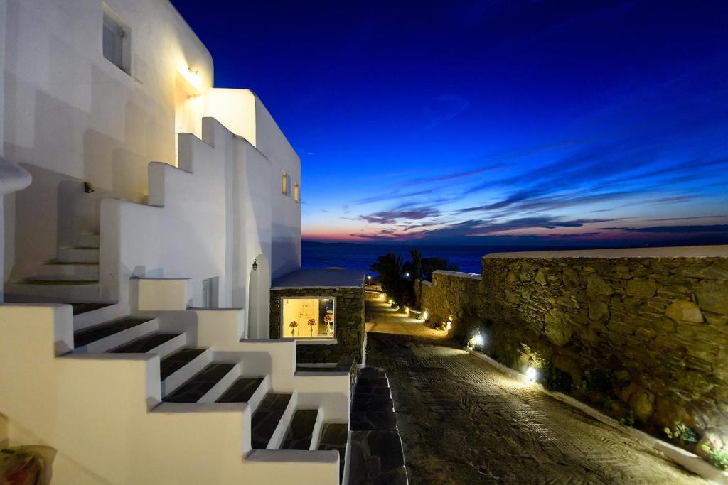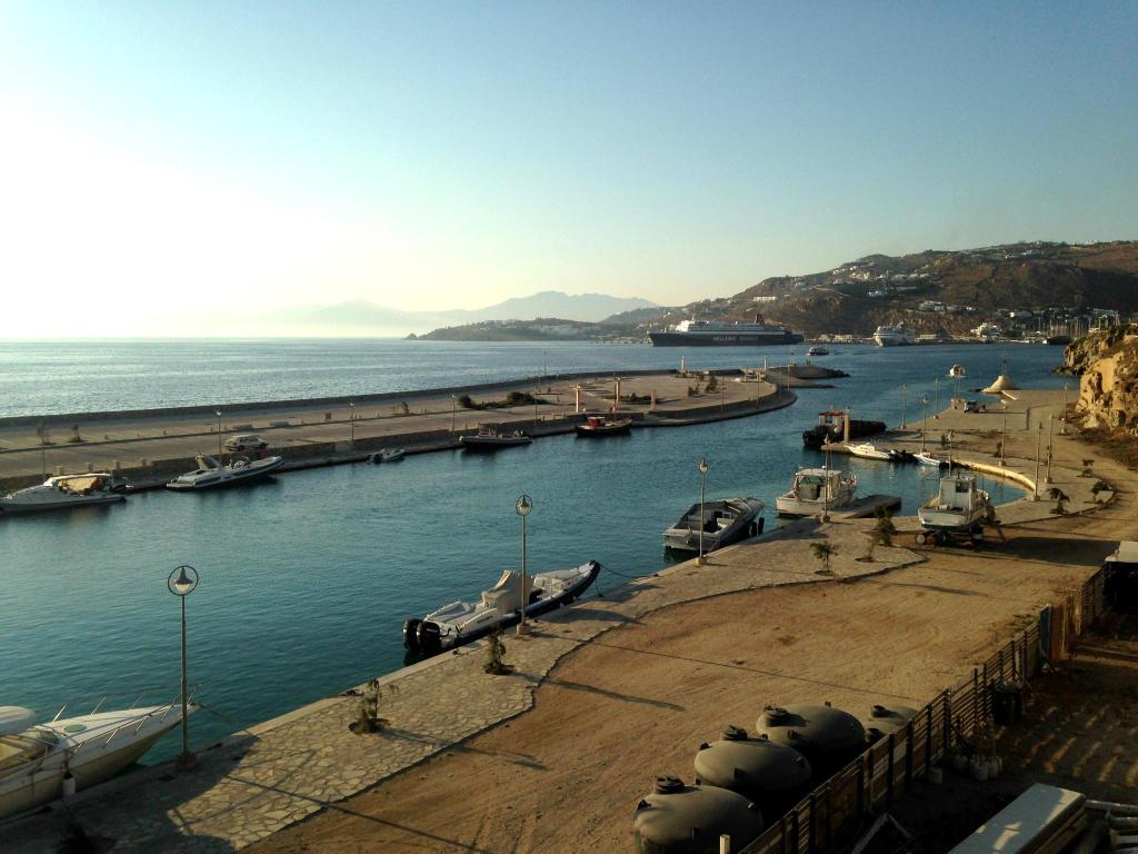 Hotelul la plajă se află în centrul al orașului Mykonos, direct pe o arteră principală, la aproximativ 1,5 km de plaja cu nisip, pentru turiști de la plajă și familii reprezintă un punct ideal de pornire pentru a descoperi orașul. Se poate ajunge pe jos în cca 5-10 minute la diverse locuri de ieșit în oraș și locuri de divertisment. Aeroportul Mykonos/Mikonos (JMK) este la aproximativ 5 km.