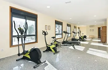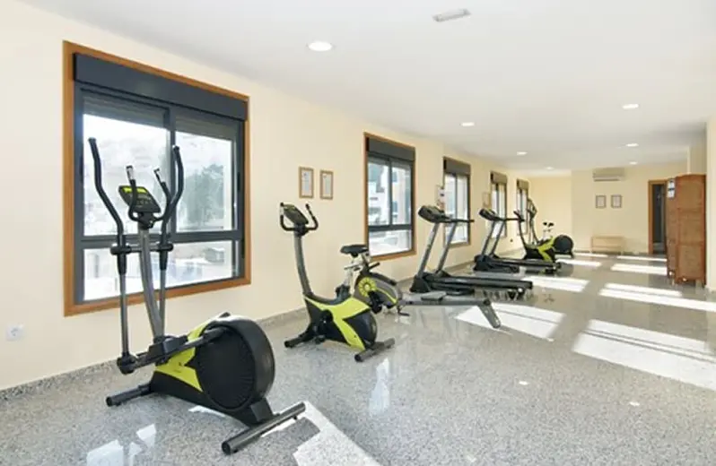 At the apartment fitness center, you have the option to engage in your daily exercise routine or simply alleviate your jet lag by breaking a sweat.