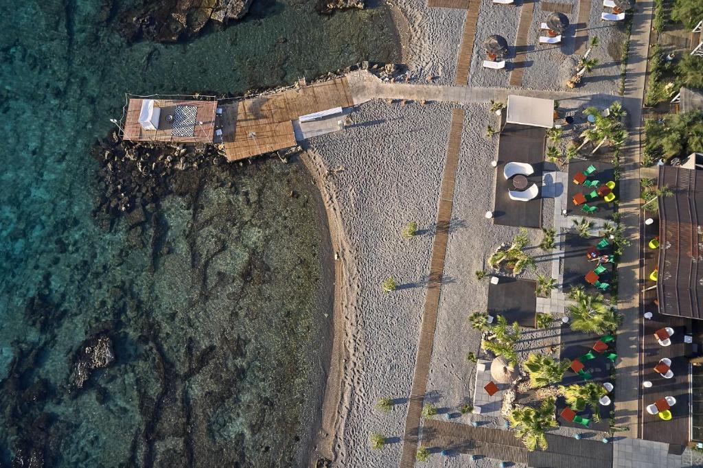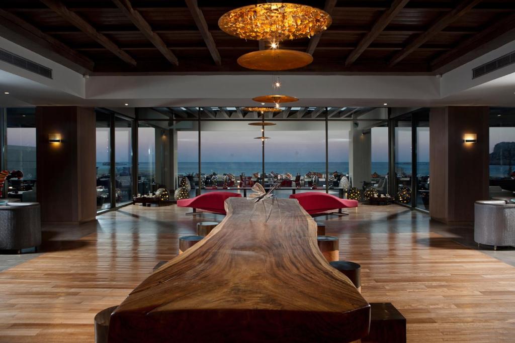 Bucătarul sef găteste preparate din bucătăria grecească si mancăruri gourmet, cu ingrediente proaspete. Oaspetii au la dispozitie un bar langă piscină, un lounge bar cu un dom impresionant si un bar pe plajă cu vedere uimitoare.