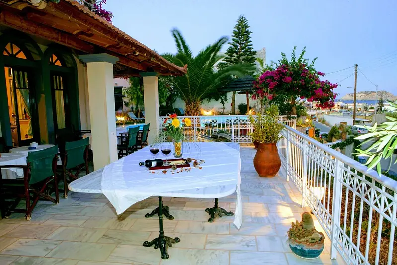 Aquarius hotel lies in the heart of the northern coast of the island of Crete, in the picturesque harbor of Agia Pelagia. It is conveniently located 18 km. from the capital of Crete, Heraklion and just 20 km. from the main seaport and airport. Aquarius is a family-run, 4-star hotel of furnished studios and apartments decorated in traditional style with local wood, marble, and stone. Each of our five studios and nine apartments are comfortable and equipped, perfect for couples and families alike. The hotel's design, both indoors and out, is also ideal for guests with any form of disability. The swimming pool is surrounded by a garden with sun loungers, it has different water levels suitable for children. Our 100m2 marble reception area and veranda offer you lavish breakfast with locally picked ingredients. Taxi transfer, car hire, and public transportation are available for an extra fee.