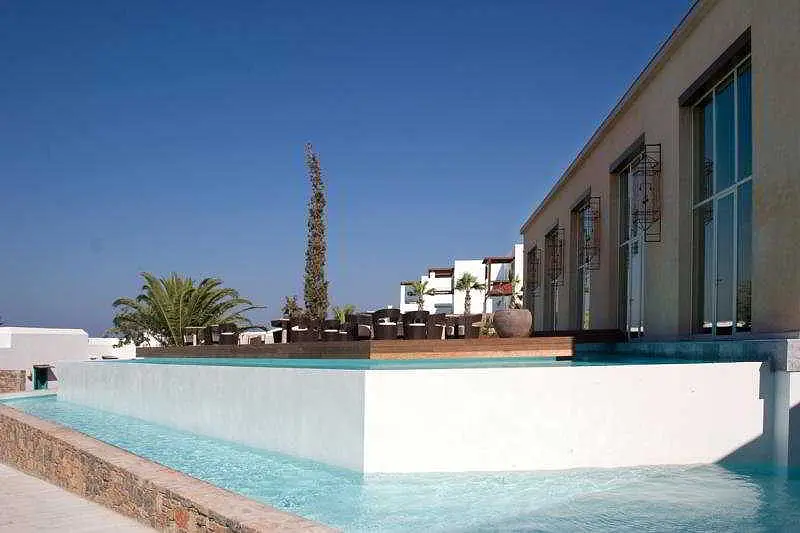 In the colourful Cretan gardens, the whitewashed bungalows slope away from the unobtrusive main building down to the private sandy cove. Breathtaking views over the islands and cascading pools add to the exotic charm of this resort. This is an ideal hotel with a variety of entertainment venues. The idea of the hotel is that it is a hotel for couples, however a limited number of children are accepted (maximum 12 children). The beach resort was renovated in 2008 and has a total of 208 rooms. Guests are welcomed into a lobby with 24-hour reception and check-out service. There is a TV lounge and restaurant on the premises. Internet access is also provided.