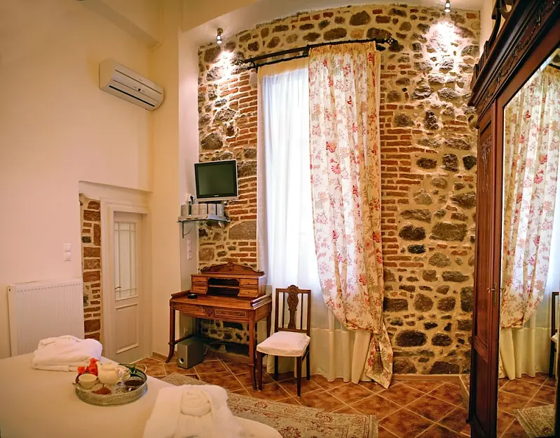 ?Archontiko Petras 1821? is a Stone House Hotel of 1821,operates throughout all year. Our hotel has five luxurious rooms overlooking the garden and the church of Petra, built on a rock, or the houses of the village.Inside the hotel, an atmosphere of an old mansion dominates, with a unique combination of antique and English Country style furniture, exciting at first sight, presenting a romantic mood which takes one back to the 18th century.The Hotel is situated in the traditional village of Petra, just 10 walking distance, minutes, away from the fantastic sandy beach and only 5 walking distance, minutes, away from the village center. Archontiko of Petra 1821 is not a pet-friendly establishment.
