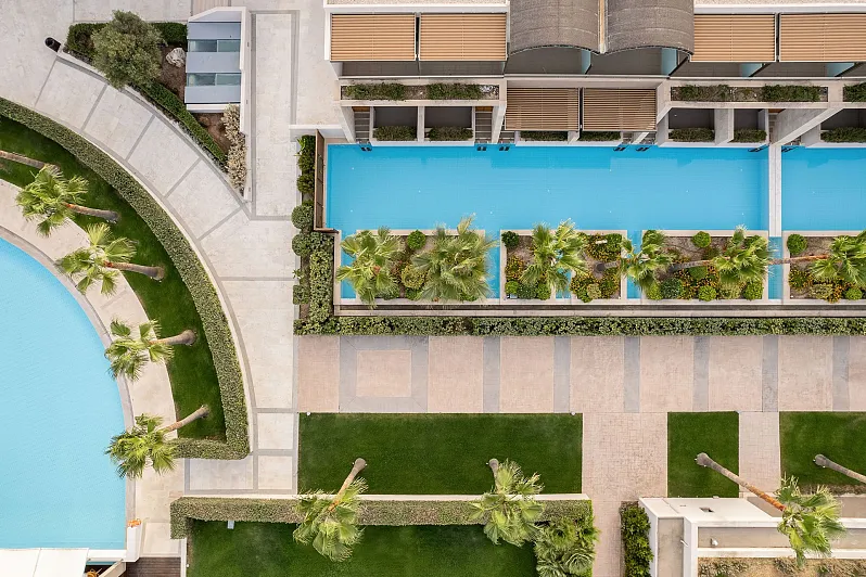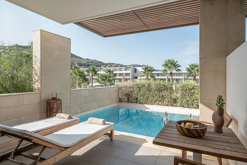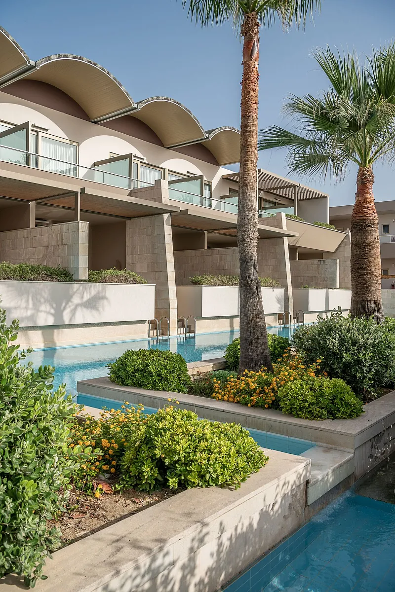 Choose among 287 spacious rooms and 41 suites, 118 of them featuring private or shared pools, and indulge in a serene environment of minimal elegance and comfort “sprinkled” with touches of fine marble, wood and natural local stone.