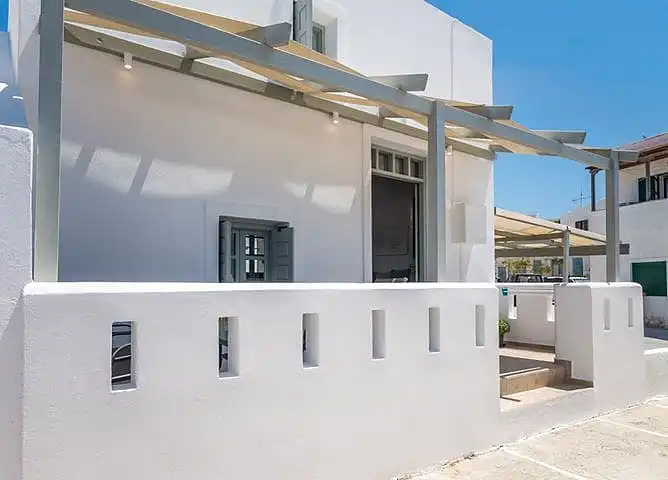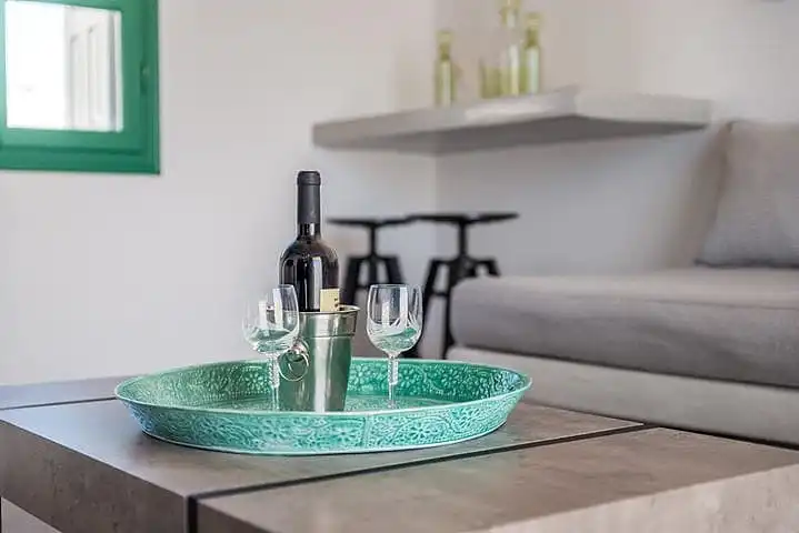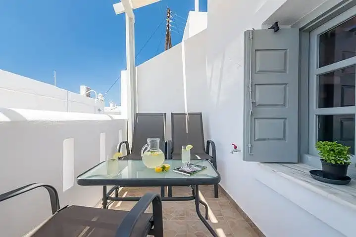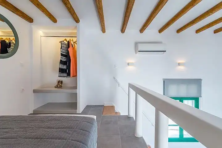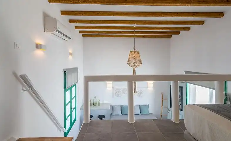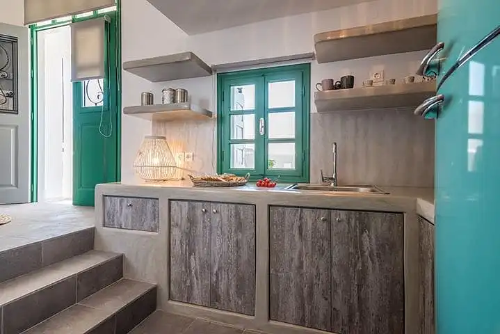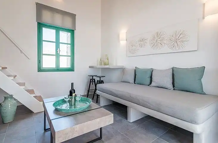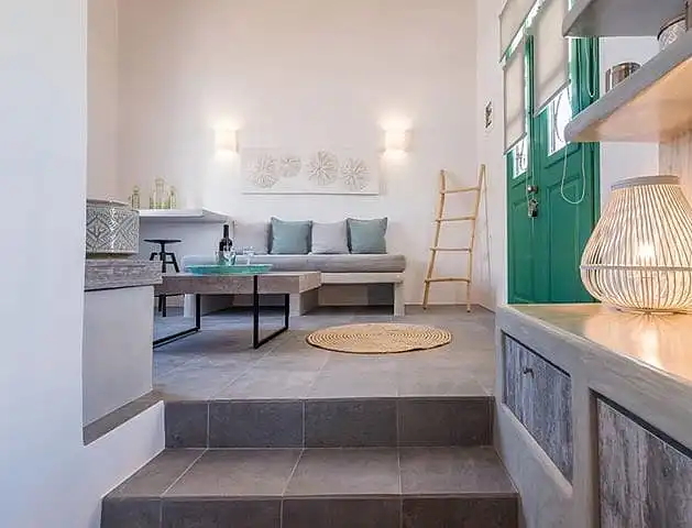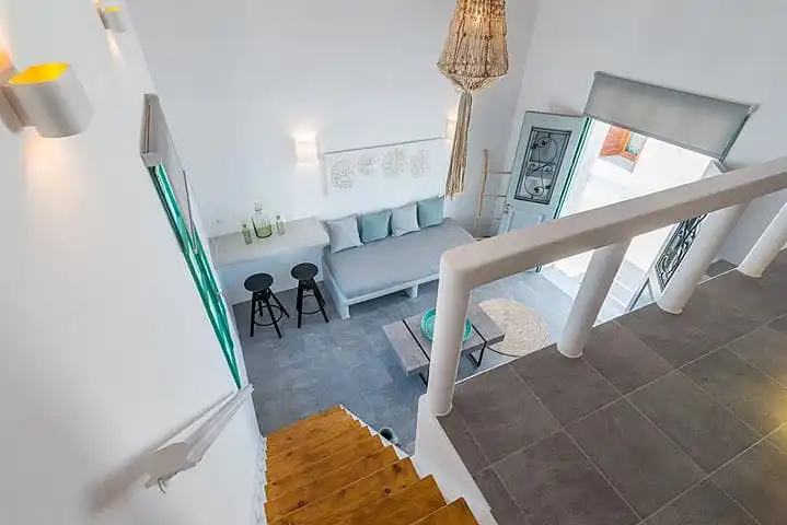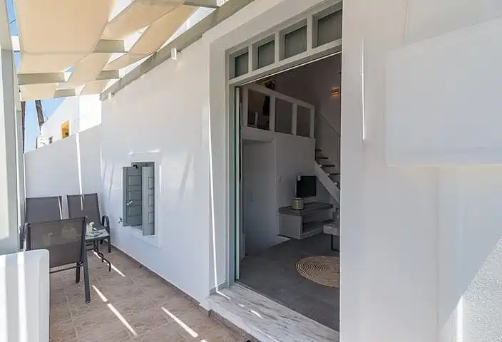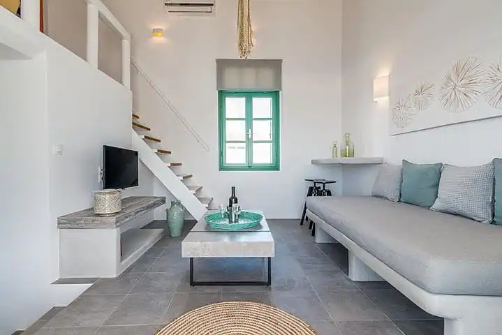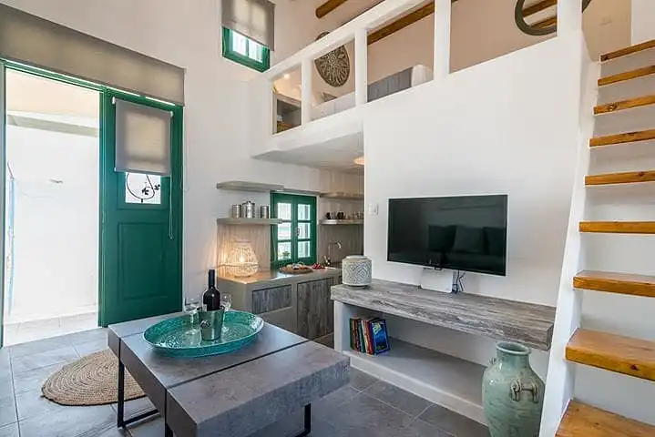 Babounis Suite is a beautiful suite of 30 sqm, which is situated in Pera Triovassalos, 2 km from Adamas port. Pera Triovassalos and Triovassalos are the first villages we meet starting from the port of Adamas, before reaching Plaka. These two, almost continuous villages, have been created on two adjacent hills, densely populated and built amphitheatrically. They are two of the central points of Milos and you can find everything you need for your holidays. The suite, which features a minimalist decor, can accommodate up to two people and is suitable for couples. It has a terrace, a bedroom in the attic, a living room and a fully equipped kitchen.