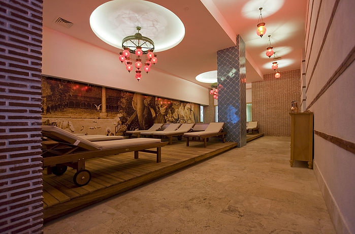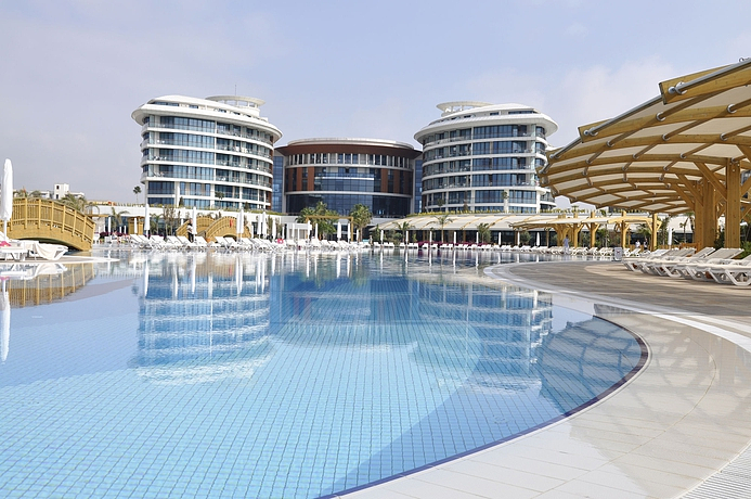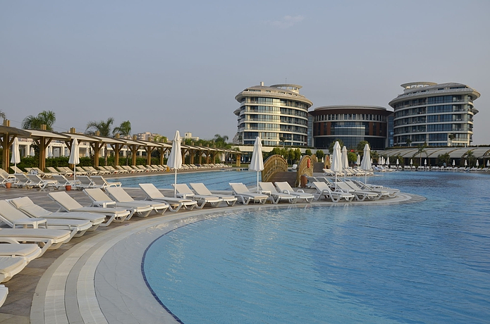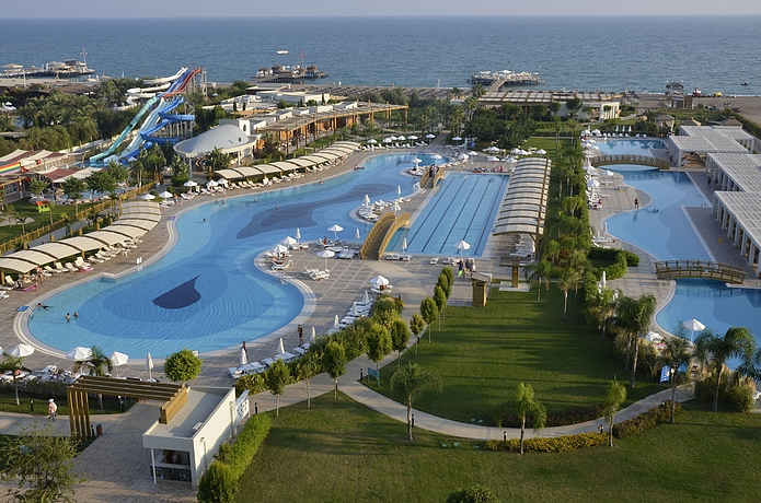 HOTEL: Este establecimiento edificado en 2009, con climatización, cuenta con 399 habitaciones, un vestíbulo con servicio de salida express, una recepción, caja de seguridad, cambio de divisa, ascensor, kiosko, peluquería, un auditorio y sala de juegos. Los clientes tienen a su disposición un patio de juegos para los mas pequeños, un miniclub, un bar, una discoteca, un restaurante, bebidas, instalaciones para conferencias y wifi. Se ofrece a los huéspedes servicio de habitaciones, servicio de lavandería y parking. SITUACIÓN: El hotel, está a 17 kilómetros del centro de Antalya, a 15 km del aeropuerto de Antalya. Está situado en el complejo turístico de Lara. HABITACIÓN: Las habitaciones cuentan con baño con ducha o bañera, aseo, secador de pelo, teléfono de línea directa, caja de seguridad, minibar, televisión de pantalla plana vía satélite, una sala de estar, cama doble, radio, internet, sistema de aire acondicionado, calefacción central y balcón o terraza.