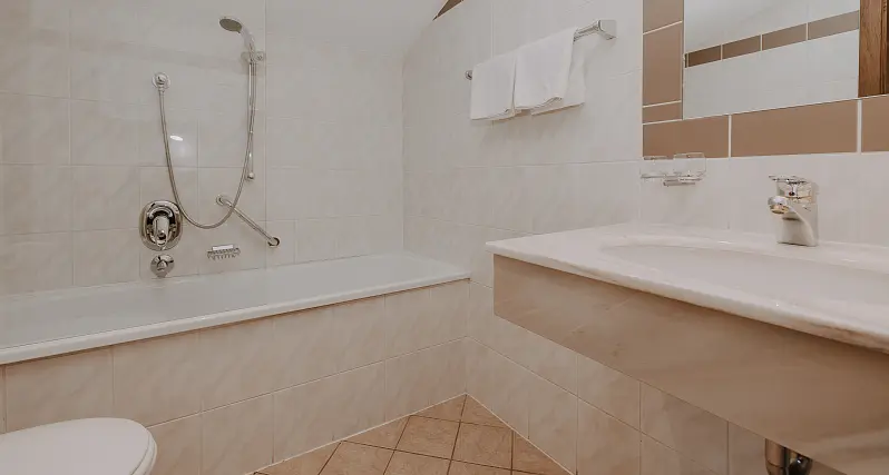 bath room: bath tub / shower, toilet, hair dryer, bath robe - on request, optional payable in resort, EUR 10.00 per person and stay