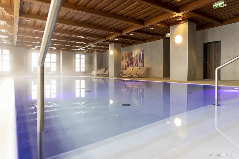 size wellness area 1500 m², swimming pool area: children of 0 years. only in the company of an adult - free of charge, indoor swimming pool 7 m x 14 m, spa area: children not allowed - free of charge, steam bath 1x - free of charge, sauna 2x - free of charge, relax room 1x, nudity area, garden