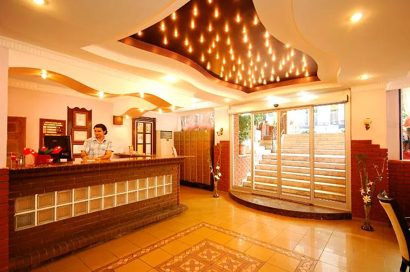 The family-run hotel is situated in the bustling city of Alanya on the Turkish Riviera, only 2 minutes walking to the well-known Kleopatra beach. The famous Red Tower is only 2 km away, the centre of Alanya with its shopping possibilities is at a distance of 1.5 km. The 5-storey hotel features 60 rooms, 24-hours reception, currency exchange, restaurant, bar, outdoor pool, childrens pool, designated smoking area, free WIFI in public areas, laundry service, car rental and free public parking close-by.