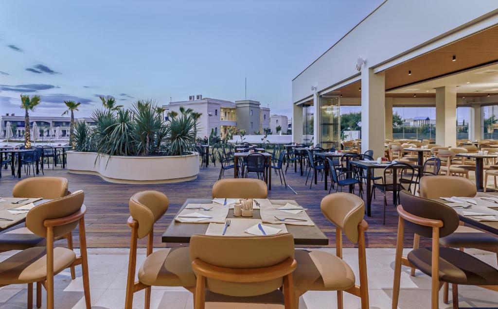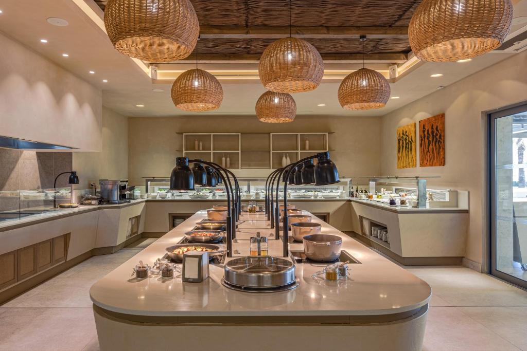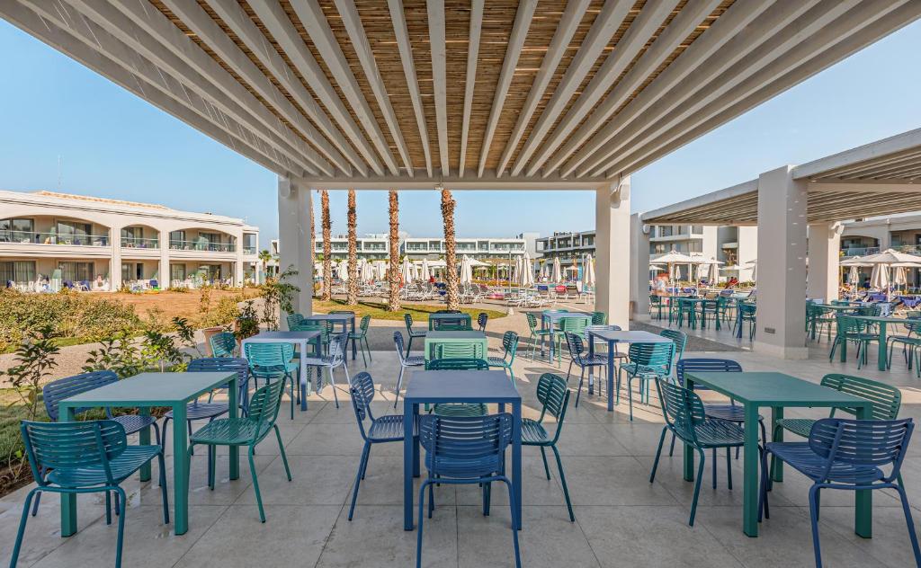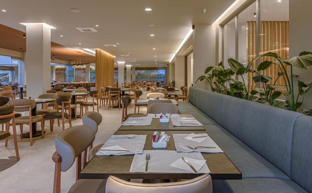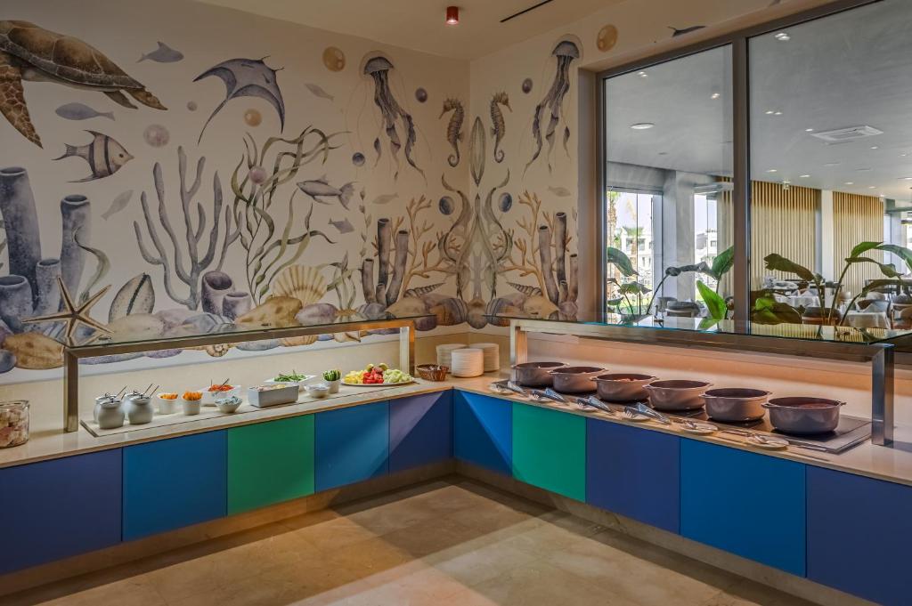 Proprietatea servește un mic dejun tip bufet, continental sau american. Blue Lagoon Queen are un restaurant care servește mancăruri din bucătăria grecească, italiană și mediteraneană. La cerere, sunt disponibile și preparate vegetariene, fără lactate și vegane.