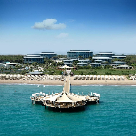 HOTEL: Este complejo deluxe y ofrece servicios de primera clase. SITUACIÓN: Se sitúa a 25 minutos de Antalya, puede encontrar a 27 km el aeropuerto de Milas. HABITACIÓN: Cuenta con chalés, suites y habitaciones deluxe. Disponen de cuarto de baño con ducha. INSTALACIONES: Puede encontrar 6 piscinas, una zona de baño infantil y un chiringuito. Con cargo extra puede encontrar tumbonas y sombrillas. COMIDAS: Se puede reservar en régimen de todo incluido. MÉTODOS DE PAGO: Se acepta Mastercard y Visa.
