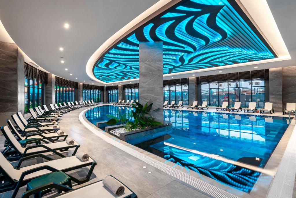 Calyptus Kirman Premium - Ultra All Inclusive se găsește in Side, la mai puțin de 1 km de Plaja Kumkoy, și are o piscină in aer liber, un centru de fitness, o grădină și parcare privată gratuită. Această proprietate oferă un lounge comun, precum și un restaurant, un parc acvatic și o terasă. Acest hotel are o piscină interioară, o saună, club de noapte și un club pentru copii.