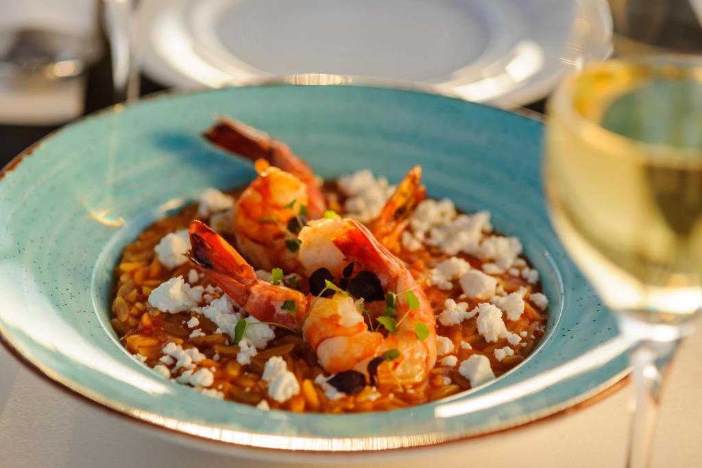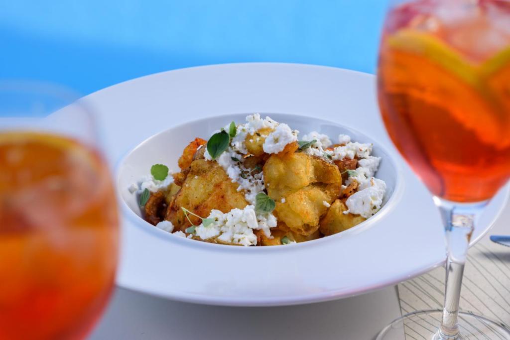 Pe tot parcursul zilei, restaurantul și lounge barul oferă cocktailuri și mancăruri mediteraneene și tradiționale cu vedere la mare. Micul dejun, pranzul și cina pot fi servite și pe terasele mobilate ale camerelor sau in zona lor privată de luat masa.