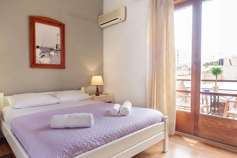 All our rooms except the Honeymoon Suite are located on the first floor of the building. All rooms have a balcony, some of them are turned to the quiet street of Kanevaro and some rooms are turned into the hotel's courtyard and all Venetian walls.