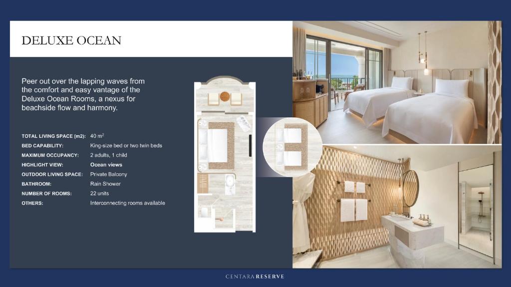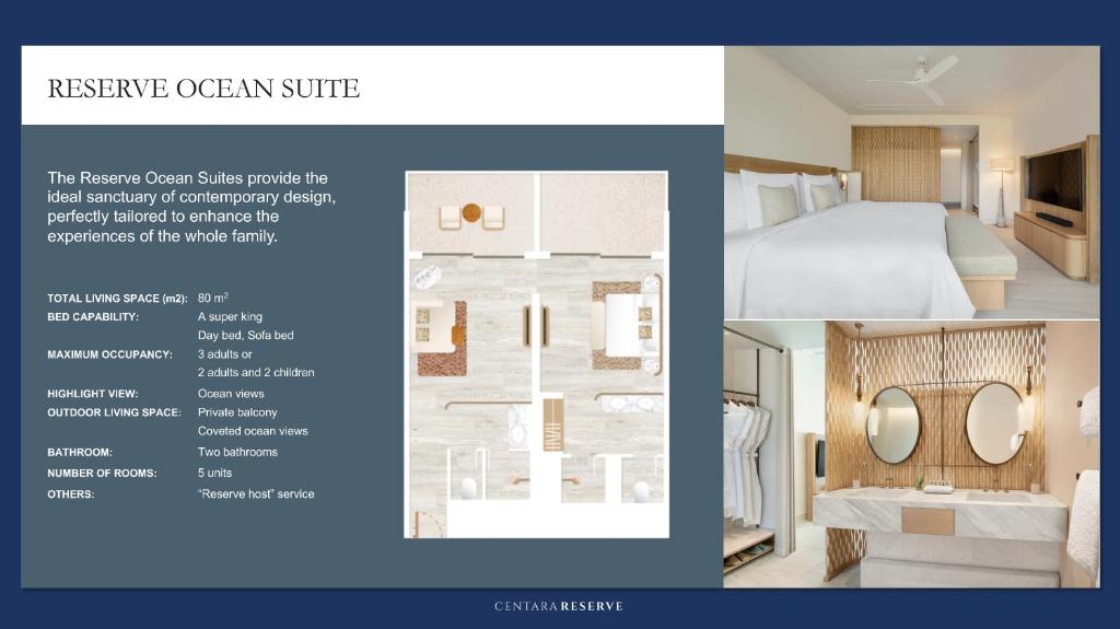 In acest refugiu discret pe malul mării, experiența oaspetelui este centrată in jurul oaspetelui individual. Călătorii au, de asemenea, răsfățat de alegere in ceea ce privește opțiunile de cazare – inclusiv apartamente și vile exclusiviste care vin cu „gazde de rezervă”, interpretarea distinctă a majordomilor personalizați de la Centara și o selecție de camere cu acces la piscină și vile cu vedere la ocean, care oferă răsfăț și mai rari. In afara sanctuarului tău privat, descoperă nenumărate modalități de a crea momente prețioase prin răsfăț holistic spa și experiențe gastronomice unice, care redefinesc peisajul culinar din destinația insulei.