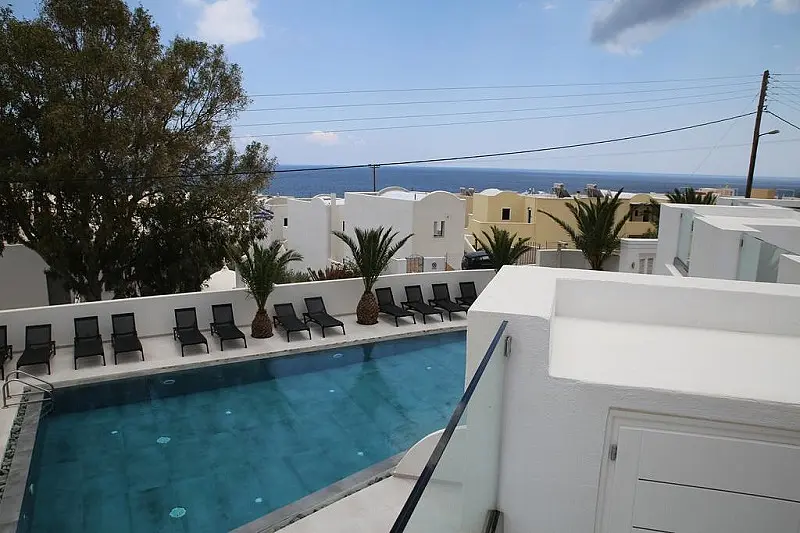 Localizat sub faleza stancoasa a anticei Thira cu vedere panoramica unica asupra Marii Egee si a statiunii Kamari. Distante: plaja 300 m, Aeroport 5 km, capitala Thira (Fira) 8 km, port Athinios 10 km, statie de autobuz 100 m, taverne, restaurante, supermarket 100 m. Promenada plina de viata cu taverne, supermarket si restaurante se afla la 100 m distanta de hotel. Arhitectura hotelului combina frumusetea liniilor albe clare cu relaxarea spatiilor deschise oferind o atmosferă liniștită de eleganta si lux rafinat. Un mix de facilități moderne cu filozofia traditionalei ospitalitatii cicladice.Facilitati hotel: