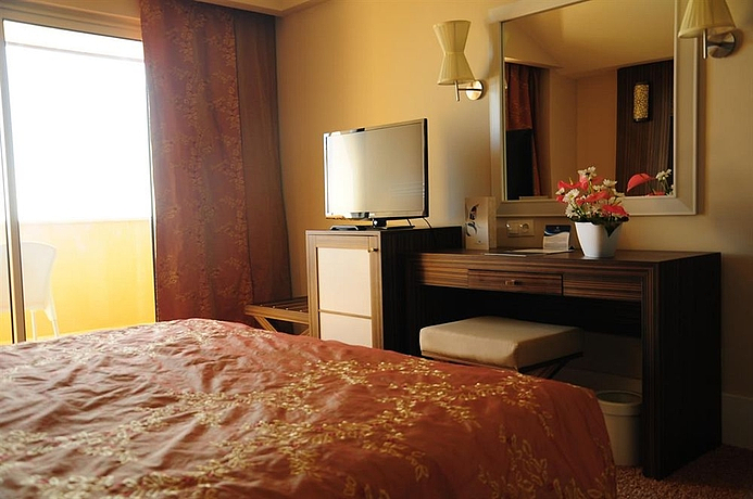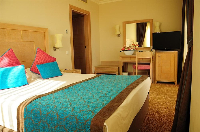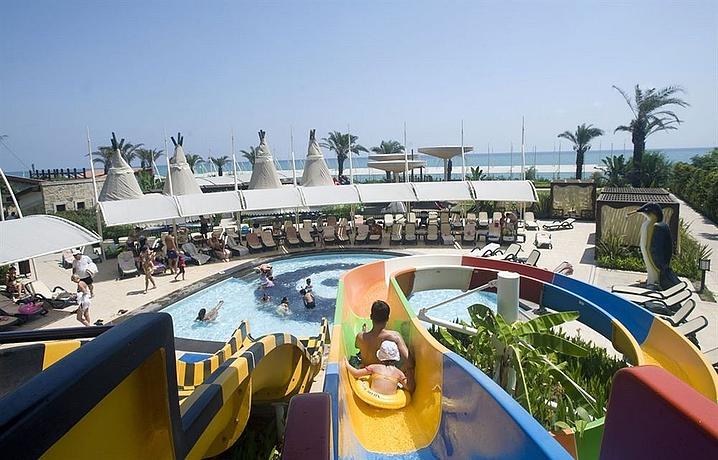 HOTEL: Este hotel de playa, cuenta con 372 habitaciones y 90 habitaciones familiares. El establecimiento construido en 2007, con sistema climatizado, cuenta con un vestíbulo, una recepción, caja de seguridad, cambio de divisa, un guardarropa y ascensor. Se ofrece prensa, peluquería, sala de juegos, un salón donde podrá ver la televisión, una cafetería, un bar, una discoteca, un restaurante, un patio de juegos para los mas pequeños y club infantil. También tiene instalaciones para conferencias y parking. Con cargo extra encontrará internet, servicio de habitaciones y servicio de lavandería. SITUACIÓN: A 40 km podrá encontrar la ciudad de Antalya y el aeropuerto de Antalya. Está situado en la playa. A 1 km del establecimiento los clientes pueden encontrar el centro de la ciudad de Bogazkent donde encontrará restaurantes, tiendas y bares. A 25 km puede disponer de Perge, puede encontrar a 15 km Aspendos, a 9 km se dispone del centro de la ciudad de Serik. HABITACIÓN: Las habitaciones tienen suelo enmoquetado, cerradura electrónica, sistema de aire acondicionado central, calefacción central, televisión satélite con canales de música, minibar, caja de seguridad y teléfono de línea directa. Además ofrece internet sin cables con cargo extra, cuarto de baño con bañera, teléfono de línea directa, secador de pelo, rociadores, detector de incendios, cama doble, radio y balcón. INSTALACIONES: Los clientes tienen disponible 5 piscinas, una piscina cubierta, piscinas con zona para niños, un bar de aperitivos, terraza, tumbonas y sombrillas. Se ofrece a los huéspedes aerobic, gimnasia acuática, el gimnasio, hidromasaje, una sauna, un baño de vapor, tratamientos de spa y servicio de masajes mediante un pago adicional. El cliente puede encontrar deportes acuáticos, esquí acuático, motos de agua, bucear, windsurf, barco torpedo, banana boat, vela, catamarán, canoa y barca a pedales. También puede jugar al tenis, jugar al ping pong, billar mediante un pago adicional, baloncesto, volley playa, bolos mediante un abono extra, minigolf y montar a caballo mediante un abono extra. Cerca se puede encontrar un campo de golf. También ofrece un programa de entretenimiento. En la playa puede encontrar tumbonas y sombrillas. MÉTODOS DE PAGO: Se acepta Mastercard y Visa. OTRAS: En cuanto a la gastronomía el establecimiento cuenta con restaurante buffet y cena servida a la carta. Puede hacer su reserva en régimen de todo incluído.
