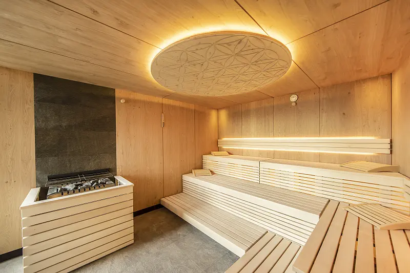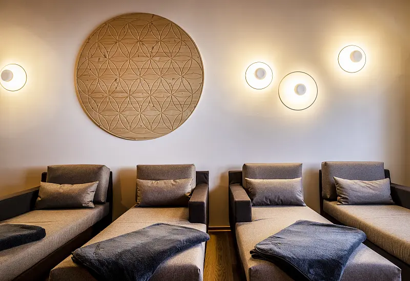 size wellness area 1500 m², swimming pool area, outdoor swimming pool 14 m x 8 m, indoor swimming pool 14 m x 7 m, spa area - free of charge, steam bath, sauna, finish sauna, bio sauna, textile sauna, infrared cabin, kneipp basin, relax room 5x, nudity area, massage - on request, optional payable in resort, solarium - optional payable in resort, garden, lawn, deck chair, sun umbrellas