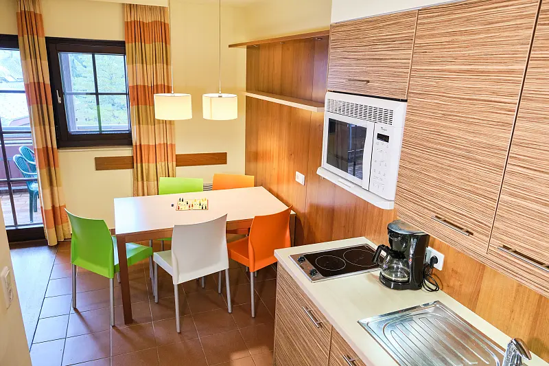 The apartment is always located in the rear part of our resort in the Walddorf. This means a little further away from the restaurant, lake and main building.