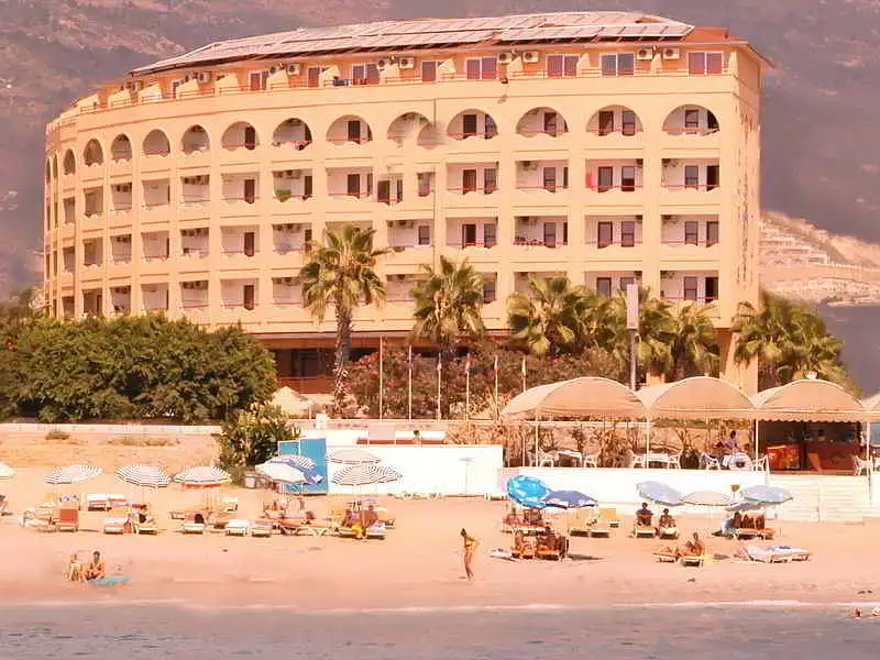 This holiday hotel is situated in the scenic countryside of Mahmutlar, east of Alanya and 12 km away from its city centre. A secure passage underground leads directly to the beach, restaurants and cafés are within walking distance. Antalya Airport is at a distance of 145 km. The hotel features 126 rooms, 24-hour reception, concierge service, WIFI, restaurant, bar, outdoor pool, childrens pool, hair dresser and free parking close to the hotel.