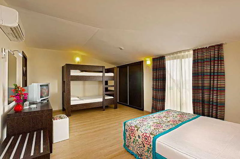 This family-friendly hotel is located 700 metres from the beach and a four-minute drive from the centre of Side on Turkeys Mediterranean coast. Public transport is available from the main road, 150 metres away, providing easy access to the centre of Side and nearby attractions such as Manavgat Waterfalls and the ancient amphitheatre at Aspendos. The hotel features two pools, one with waterslide, a sand volleyball ground, and relaxation facilities such as a sauna and hammam for guest leisure. The spacious rooms are luminous and bright with air-conditioning and private balconies, and the onsite restaurant serves both buffet-style and a la carte meals while the pool bar offers drinks and snacks beside the sparkling outdoor pool, all for a relaxing family holiday by the sea.
