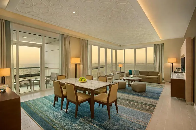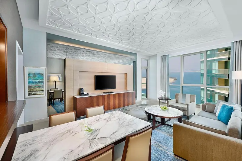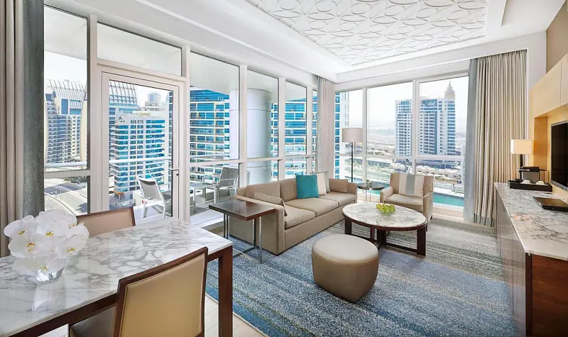 This upscale all-suite hotel offers private access to the beach, beach cabanas and the private pool. All suites have private balconies with views of the Arabian Sea or Dubai Marina as well as a separate living room.