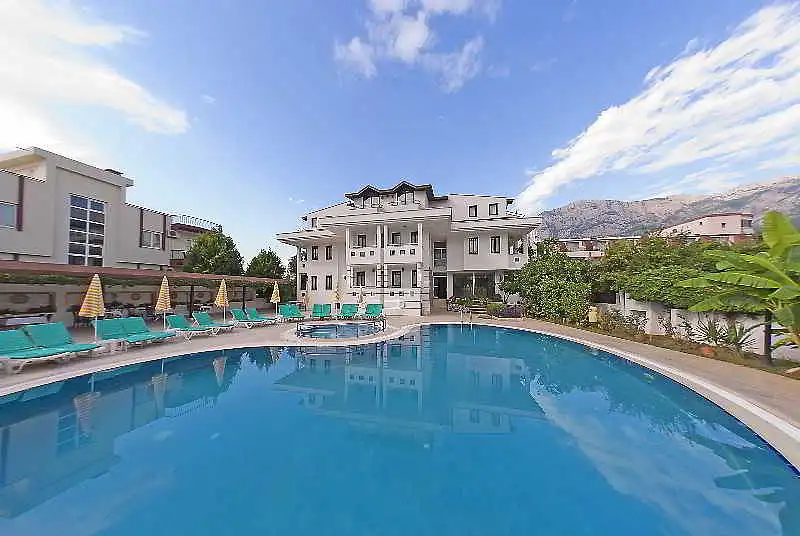A small and cosy hotel with a spacious paved garden located on the road leading into the resort of Kemer and 150m from the pebble-shingle beach. The centre of Kemer is just over a kilometre away and within easy walking distance or the local minibus service runs past the hotel with a stop a few metres from the hotel entrance. Simply but pleasantly furnished, the hotel has a foyer with a cooling, marble floor and seating area and in the garden guests can enjoy a drink or meal under shaded canopies. Surrounded by orange groves, this hotel is close to the resorts amenities and the beach and within easy access of public transport.