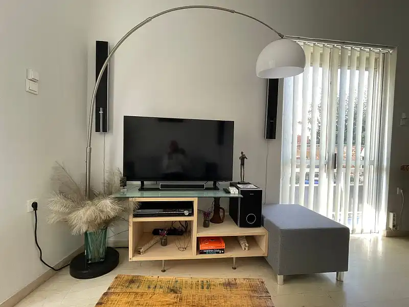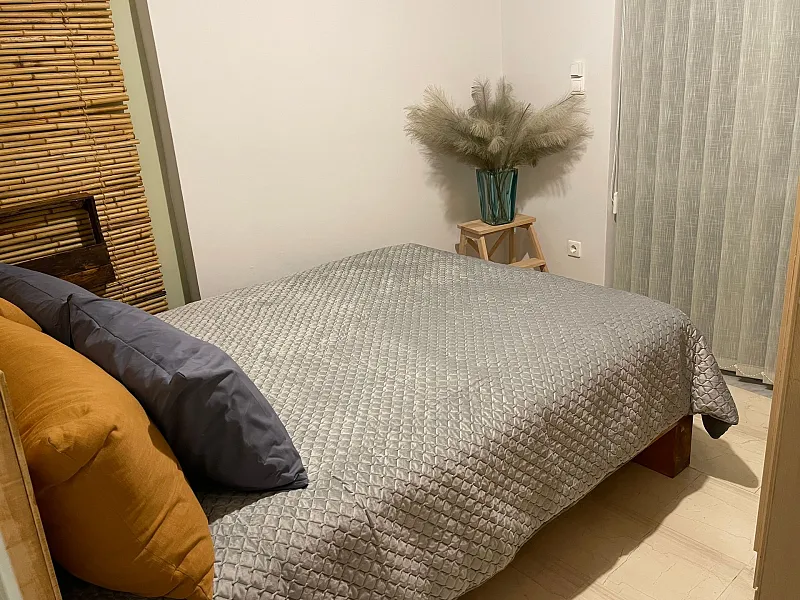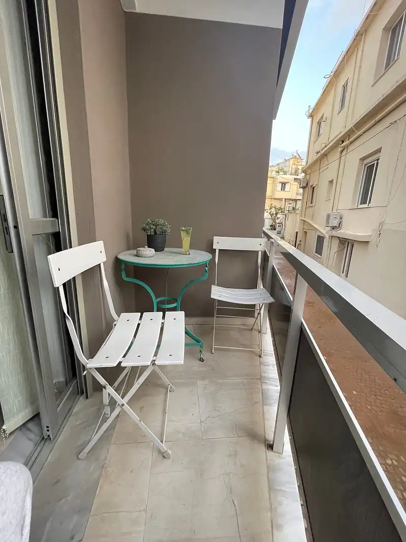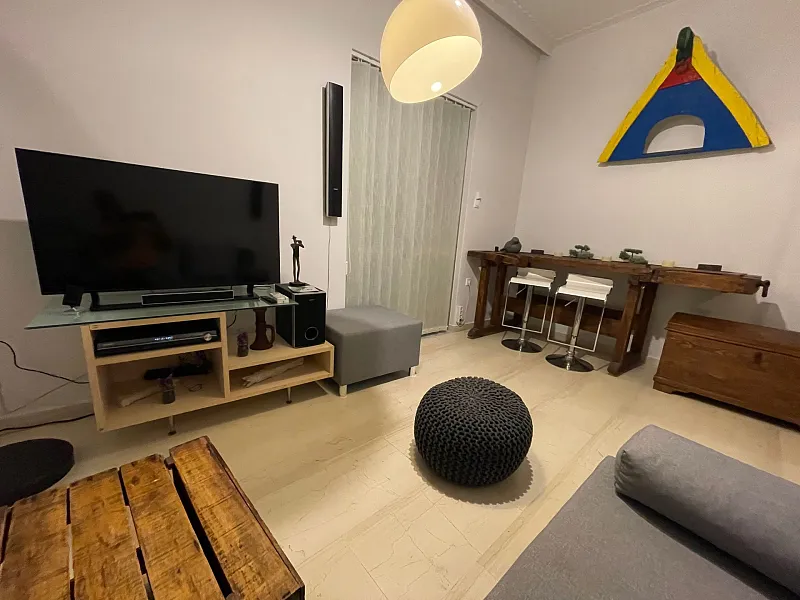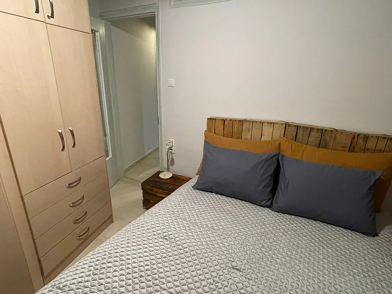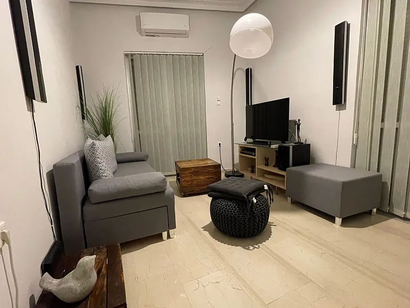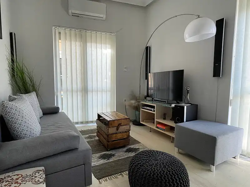 It consists of one bedroom with a large double bed, a well-seated living room with sofa-bed, spacious kitchen with dinning table, bathroom with shower and two small balconies.