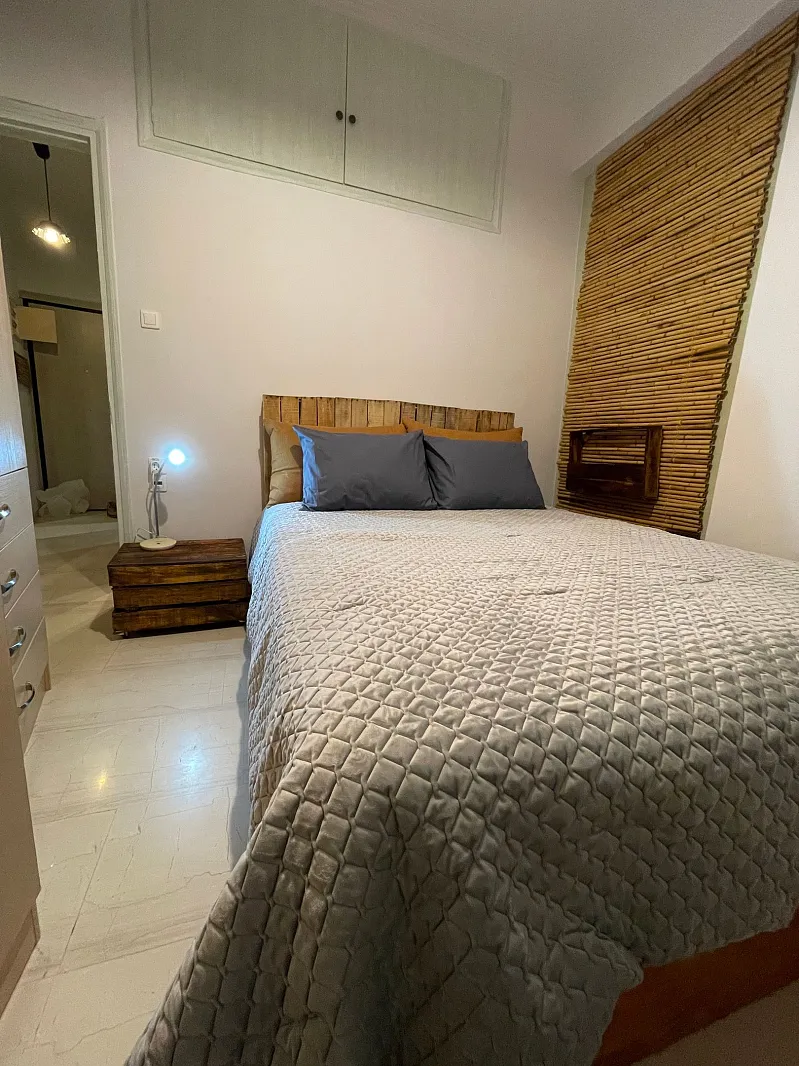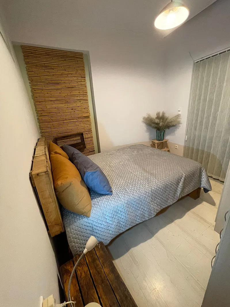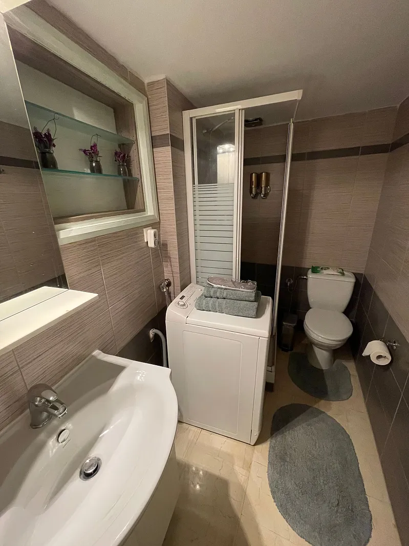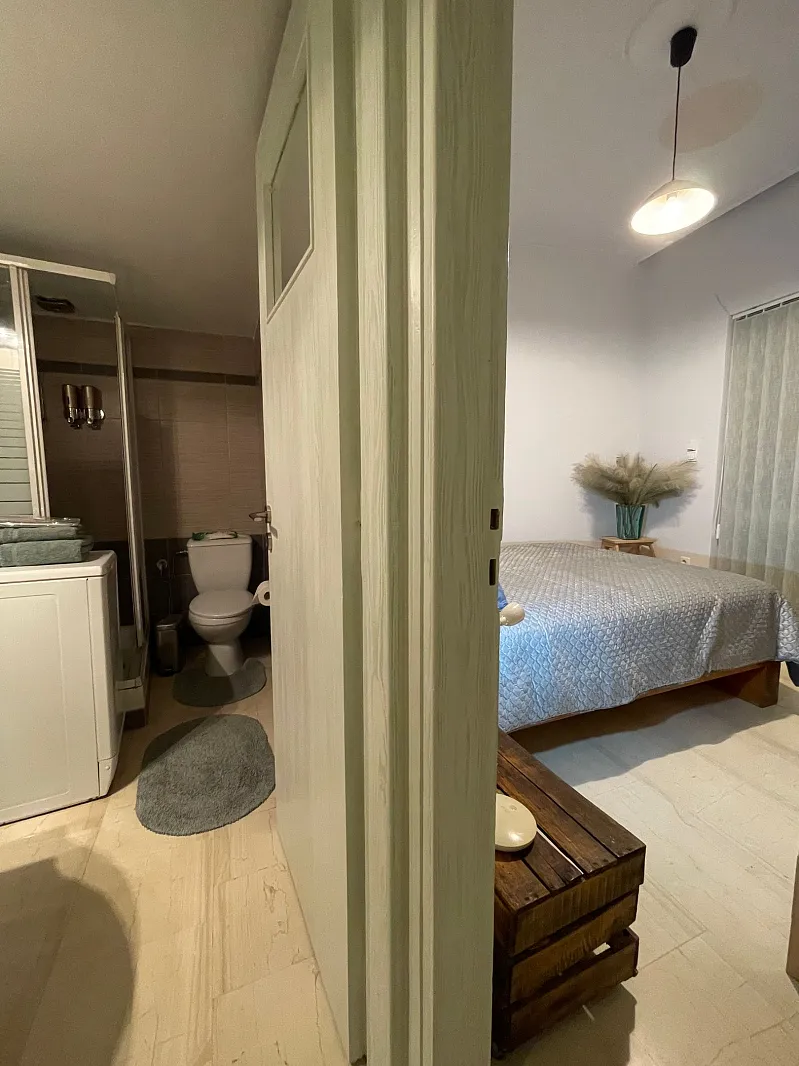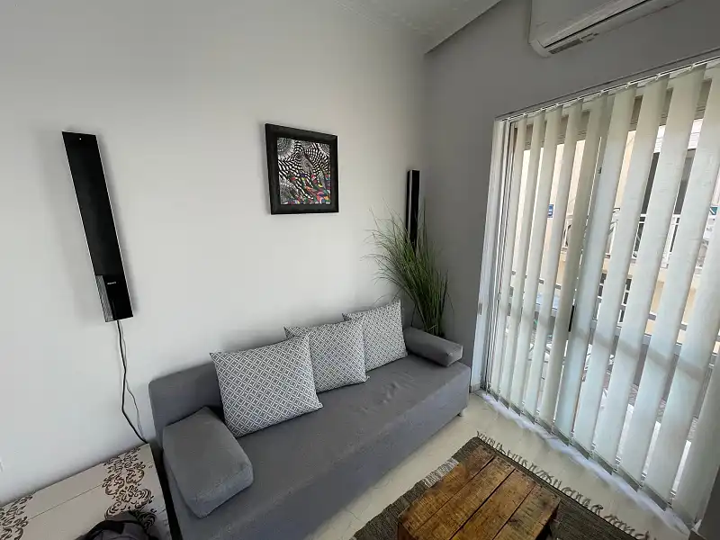 It consists of one bedroom with a large double bed, a well-seated living room with sofa-bed, spacious kitchen with dinning table, bathroom with shower and two small balconies.