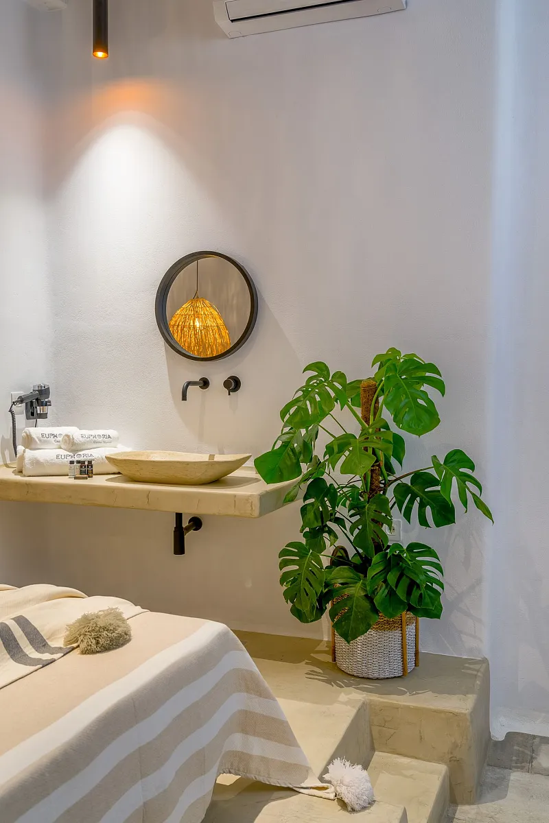 Euphoria luxurious suites are designed in such a way to reflect the traditional Cycladic architecture. Local treasures are used as materials, all meticulously chosen in order to define a stylish effect.