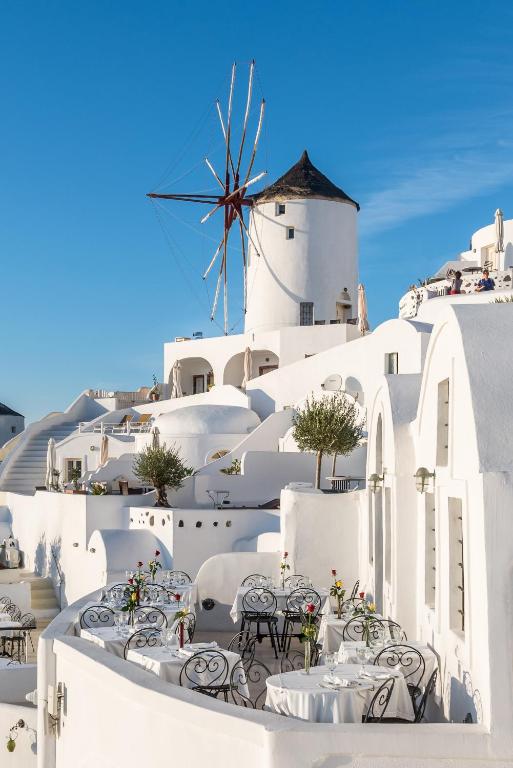 Restaurantul servește preparate din bucătăria locală cu o notă modernă. Mesele sunt servite și in suite. Sun Spirit Café-Bar servește băuturi răcoritoare și gustări. Zilnic este servit un mic dejun din Santorini.