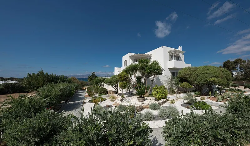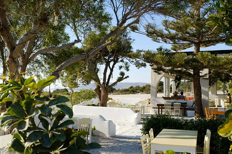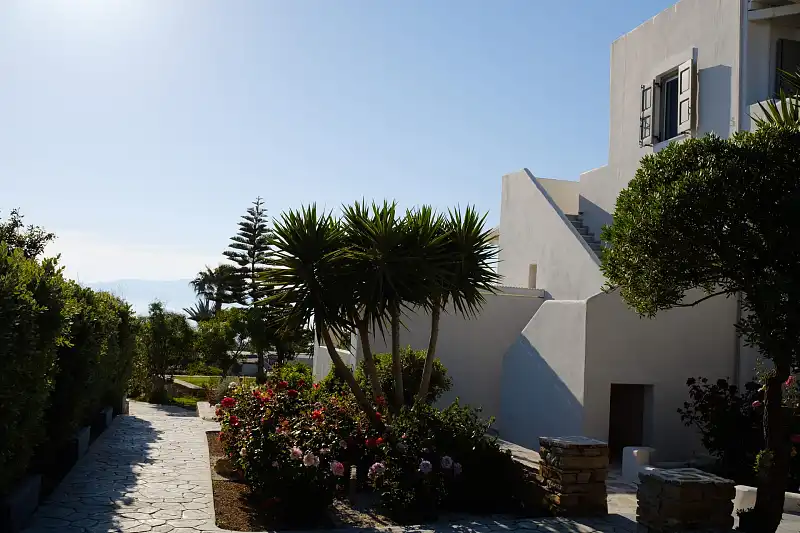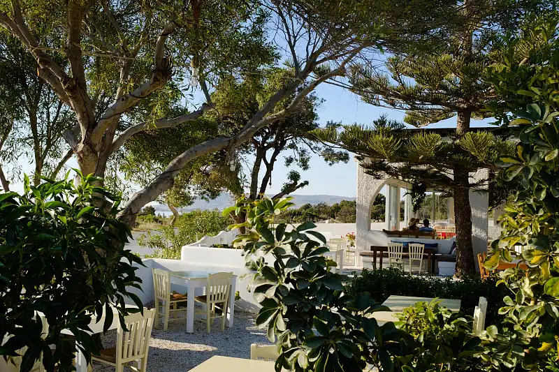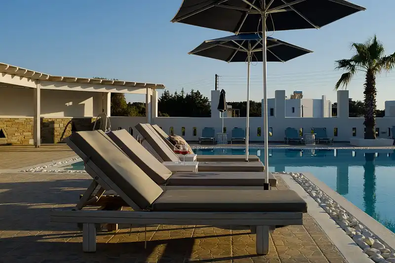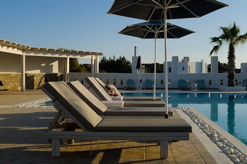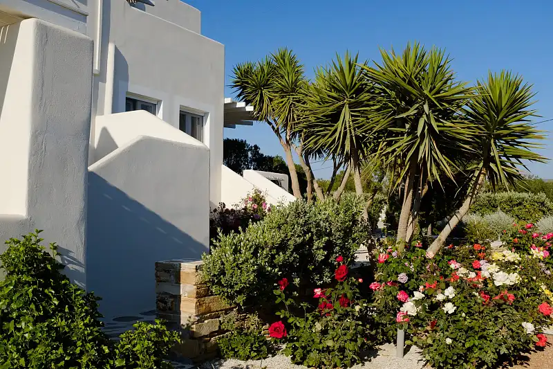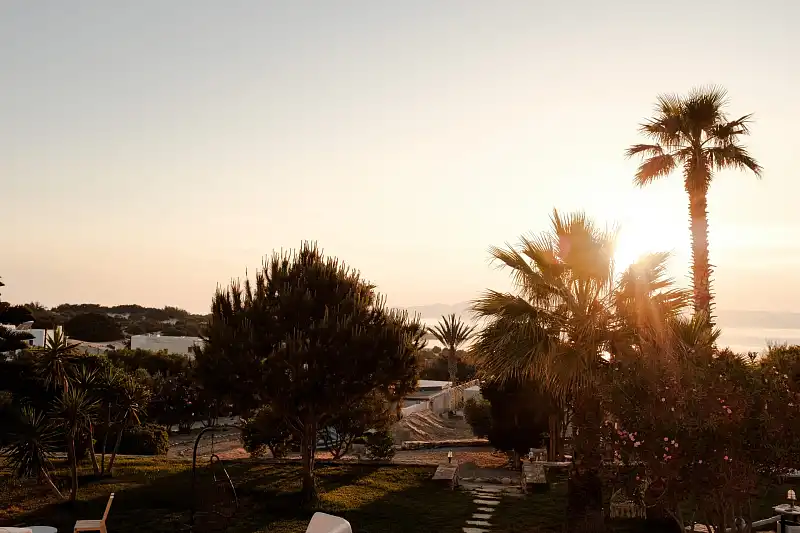 Cedar trees on the sand dunes of Alyko, amazing beaches and coves in a walking distance, colorful gardens, stunning views of the sea and the sunset, infinity swimming pool, cocktail pool bar, traditional food and family hospitality is what you can expect at Faros...