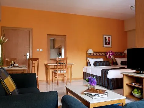 chicineta echipata cu aragaz electric, frigider, fierbator electric, cuptor cu microunde etc., zona dining, TV, masina de spalat, seif, acces Internet in camere.