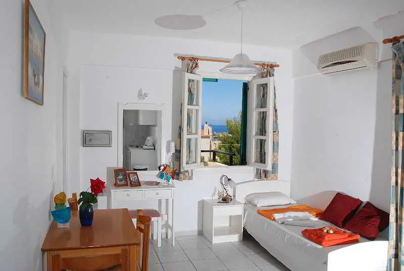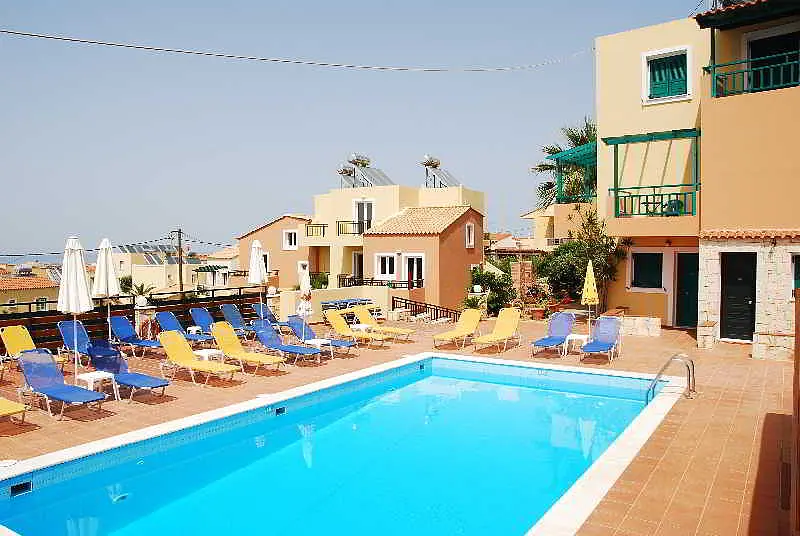 Perched on the hillside between the bustling town of Hersonissos and the tranquil village of Piskopiano, this complex offers sea views and affordable accommodation only 700 metres from the sandy beach. The common area features a swimming pool and sun terrace, where guests can enjoy the benefits of sea and water without leaving the premises. They can prepare a homemade meal in the privacy of their own fully equipped kitchenettes or join for a fun barbeque night once a week. Alternatively, they can try authentic Greek recipes in one of the numerous local taverns in the village, just a 10-minute walk away.