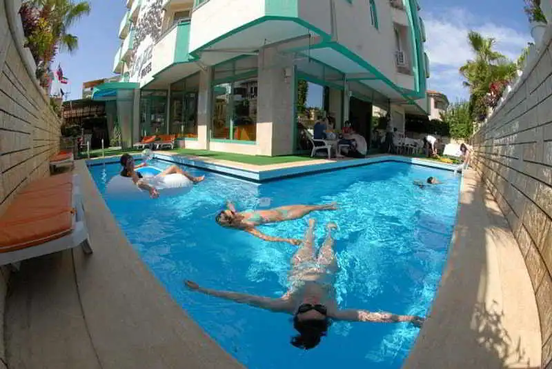 This contemporary hotel is situated in the Lara Beach area of Antalya. The hotel is ideal for exploring the area, as the beautiful lower Duden waterfalls are just 1 kilometre away, and the upper falls, ancient city of Myra with its rock-cut tombs, and the Greek and Roman ruins near Side and Aspendos are all within easy reach. The hotel also offers a free shuttle service to Lara beach, just 3 kilometres away. The comfortable en suite rooms all come with air-conditioning, WIFI and balconies with sea views. Guests can wake up to a satisfying breakfast buffet in the hotel restaurant, or elect to have breakfast in bed with 24-hour room service, and drinks and snacks can be found throughout the day at the hotels poolside bar. For those who enjoy fishing, the seashore is just two minutes away and the restaurant is happy to cook guests freshly caught fish. This is the perfect base from which to take in culture, take pleasure in the great outdoors, or simply lounge in the sun by the pool.