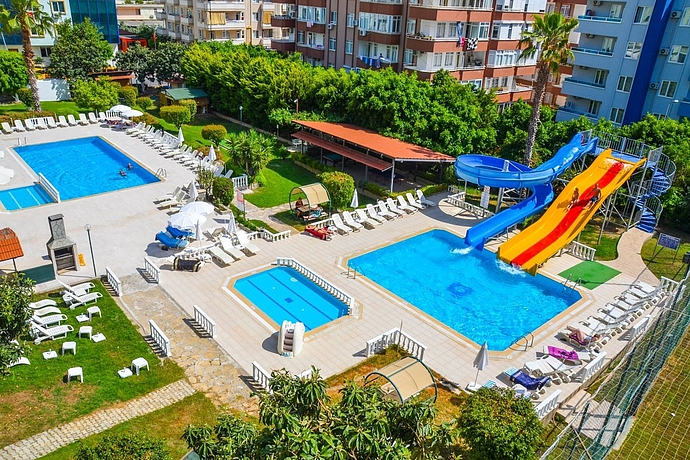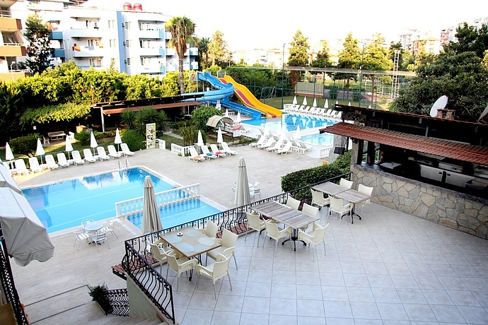HOTEL: Este hotel edificado en 1996, reformado en 2001, cuenta con una recepción, ascensores, una piscina, una cafetería, un bar y un restaurante. También ofrece internet, servicio de cambio de moneda, un pequeño supermercado, parking, club infantil y centro fitness. Algunos servicios con cargo adicional. SITUACIÓN: A un kilómetro del establecimiento los clientes pueden encontrar el centro de la ciudad de Alanya. Está situado a unos 800 metros de la playa. Puede encontrar en los alrededores restaurantes, bares y una parada de transporte público.