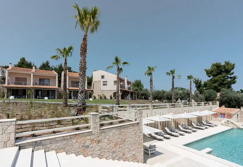 Helios Blue Villas is a collection of 26 elegant sea-view homes in Halkidiki, Greece, perfectly positioned between lush natural surroundings and modern conveniences. Located just a short drive from Thessaloniki airport, the complex offers easy access to shops, restaurants, and beaches, while maintaining a sense of peaceful seclusion. Each villa is uniquely designed with a private entrance, stylish interiors, and a fully equipped kitchen. Whether you're traveling as a couple, family, or group of friends, Helios Blue offers the comfort of a second home—tailored for memorable summer escapes.