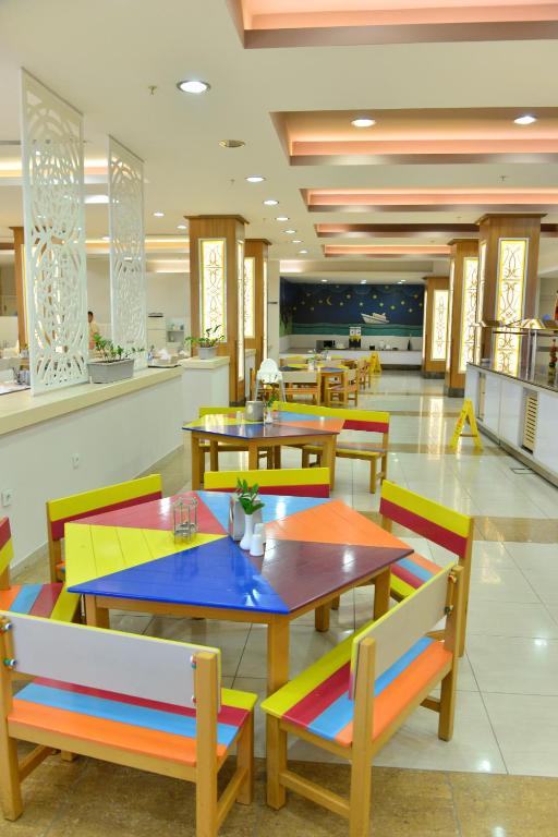 Proprietatea servește zilnic un mic dejun tip bufet, vegetarian sau halal. Holiday Village Türkiye are un restaurant care servește mancăruri din bucătăria englezească, grecească și italiană. La cerere, sunt disponibile și preparate fără lactate, halal și fără gluten.