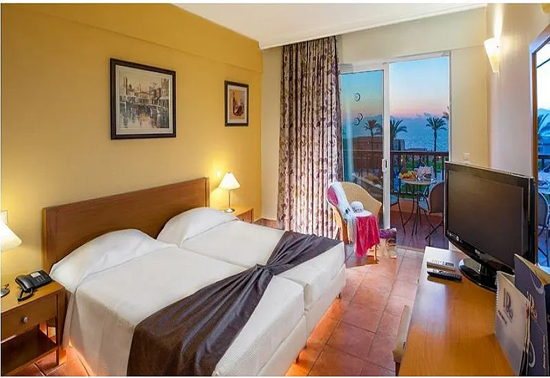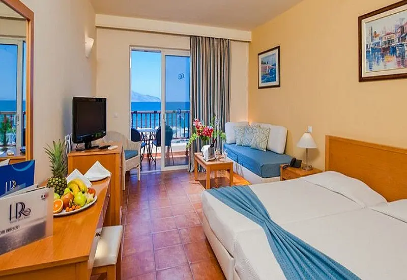 baie, balcon, aer conditionat, telefon direct, conexiune internet, TV satelit, radio, frigider, detector de fum, seif (contra cost). Camerele pot avea vedere la gradina sau la mare. Camerele family sunt elegante, se afla in bungalouri nou construite in stil aegean si pot caza pana la maxim 4 adulti.